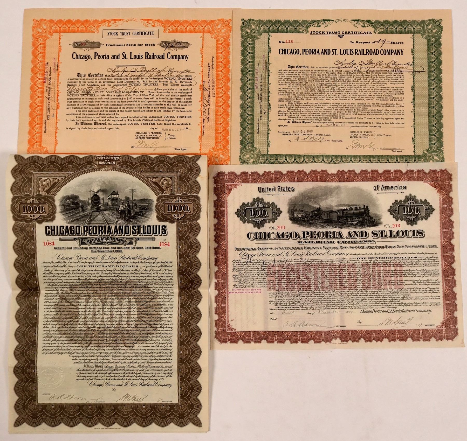 Two different bonds, one issued in 1909, $100. 4 1/2% gold bond due 1939. Two oncoming trains from left to right. Franklin Lee Bank Note. Unc. Second bond is issued in 1913 for $1,000, 4 1/2%, gold bond due 1939. Vignette shows a train running straight on with workers on both sides. ABN, New York. Uncancelled. In addition, we have two Stock Trust Certificates, one in green for 19 shares and one in orange for $92.50 of fractional scrip for stock. Both of these Stock Trust Certificates are not listed in Cox. Both issued in 1913 and uncancelled. This is a nice grouping from this railroad.
