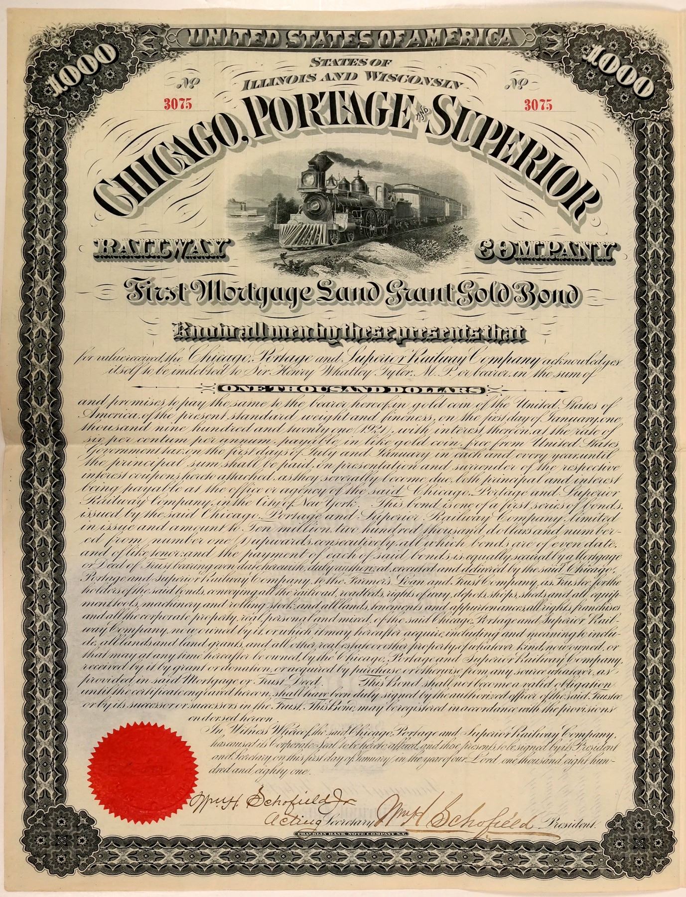 Cert. #3075, issued in 1881. $1,000 Land Grant gold bond, 40 year, 6%, due 1921. 45 Coupons attached. Train in oval vignette runs right to left. Franklin Bank Note, N.Y. Black on creme.