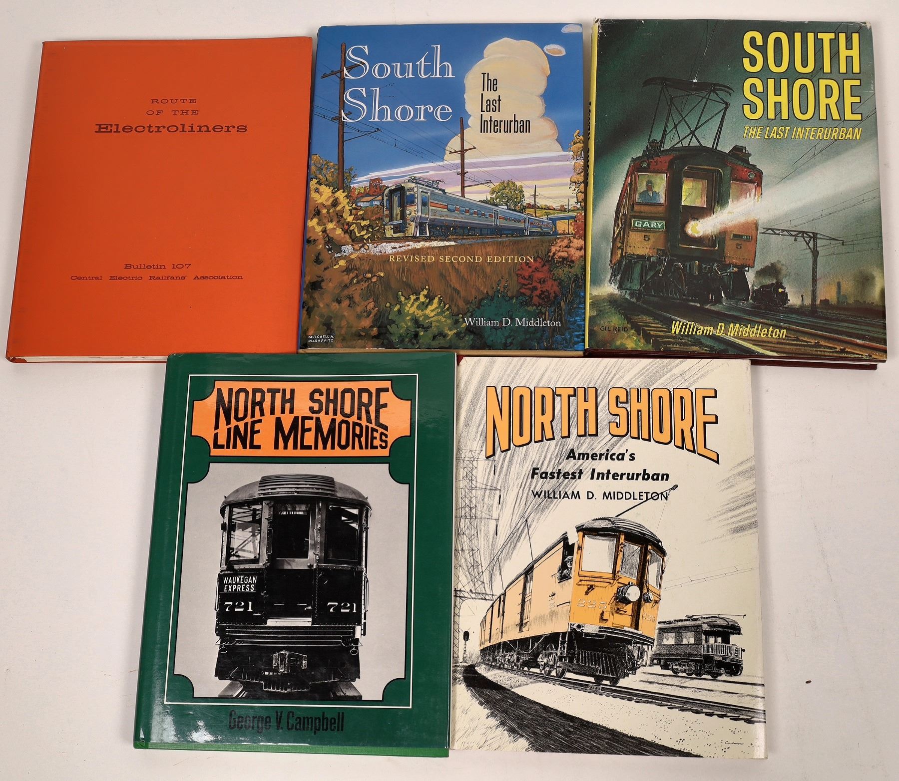 Group of five (5) publications about the rail service in and around Chicago and its metropolitan area. First is "North Shore, America's Fastest Interurban" by William Middleton. Fascinating history of the Chicago, North Shore & Milwaukee Railroad from its beginnings as a modest trolley line in Waukegan to its growth under Samuel Insull and its emergence as the country's fastest interurban. The author details the whole exciting history, including the boom years for freight and passenger service during World War II and the massive Electroliners. With schematic diagrams of rolling stock. Illustrated throughout with over 200 black and white photos. End papers show detailed system map. 128 pages. Also: "Route of the Electroliners" by The Central Electric Railfans' Association. This is the first edition of this book (which includes four full page glossy color photographs not found in later editions). In this volume, CERA provides a detailed history of the North Shore Line (the Chicago, North Shore & Milwaukee Railway) after 1926, examining its expansion, growth, and challenges. Also included, are "North Shore Line Memories" by George Campbell and more. Dust Jackets are in decent shape with slight tearing and creasing. Please see photos for more detail and condition. Illinois Chicago