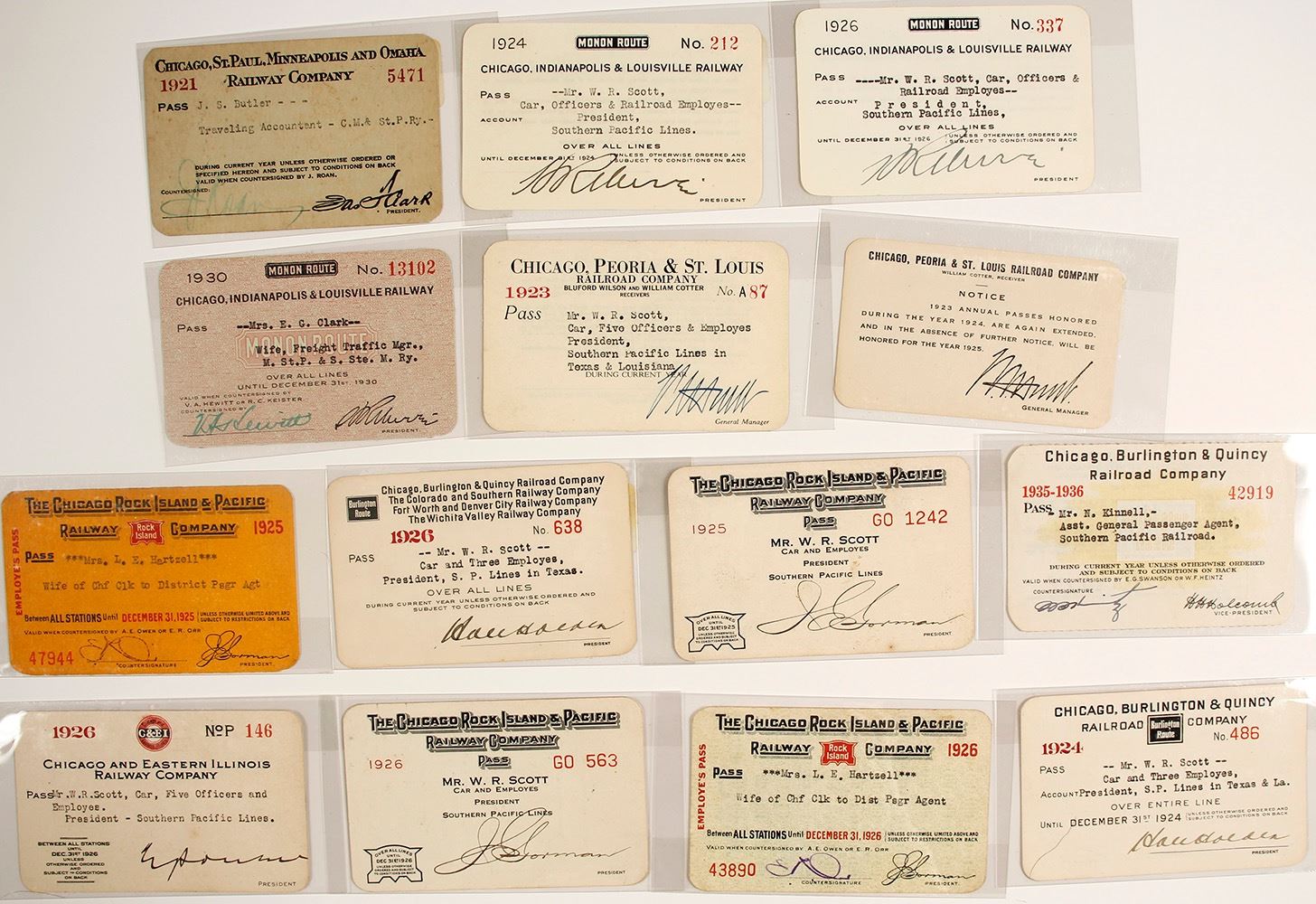 Lot of 14 passes from six different "Chicago" railroads. 1) Chicago, Burlington & Quincy: 1924, 1926, and 1935. 2) Chicago Rock Island & Pacific Railway: two different for 1925 and two different for 1926. 3) Chicago, Peoria & St. Louis Railroad: 1923 and 1924. 4) Chicago, Indianapolis & Louisville Railway: 1924, 1926, and 1930. 5) Chicago, St. Paul, Minneapolis & Omaha Railway: 1921. 6) Chicago & Eastern Illinois Railway: 1926. (Potter Collection) HWAC# 59954 Date: 1921-1935 Location: Chicago, Illinois