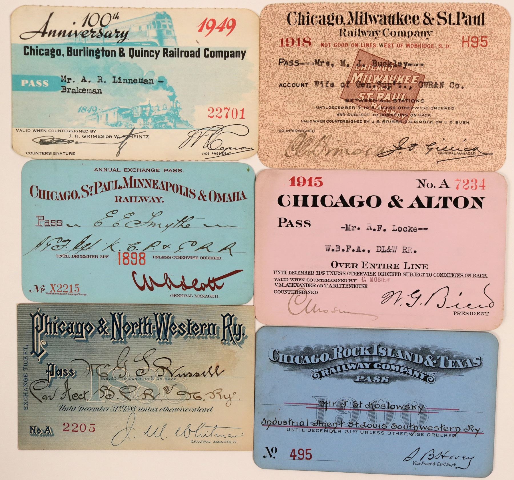 Lot of 6 different. 1) Chicago & North-Western Railway. Issued in 1888. 2) Chicago, St. Paul, Minneapolis & Omaha Railway. Issued in 1898. 3) Chicago, Rock Island & Texas Railway Company. Issued in 1900. 4) Chicago & Alton. Issued in 1915. 5) Chicago, Milwaukee & St. Paul Railway Company. Issued in 1918. 6) Chicago, Burlington & Quincy Railroad Company. Issued in 1949. 100th Anniversary.