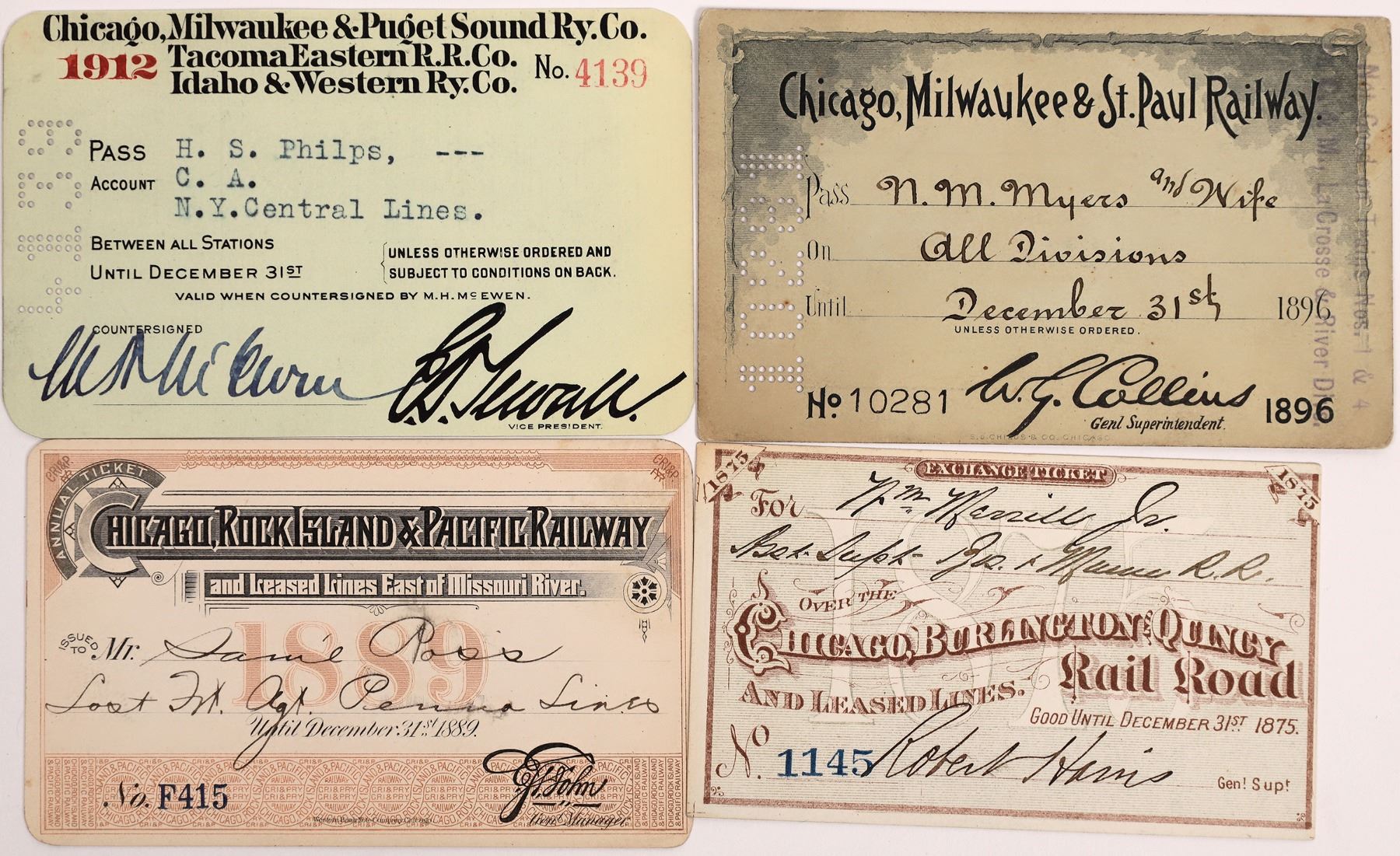 Lot of four passes from Chicago railroads: 1) 1875 Chicago, Burlington & Quincy Railroad and leased lines, No. 1145, issued to N. M. Merrill Jr.; 2) 1889 Chicago, Rock Island & Pacific Railway and leased lines East of Missouri River, pass No. F415, issued to Sam's Ross; 3) 1896 Chicago, Milwaukee & St. Paul Railway pass No. 10281, issued to N. M. Myers and Wife; 4) 1912 Chicago, Milwaukee & Puget Sound Railway Company Tacoma Eastern R.R. Co. Idaho & Western Ry. Co. No. 4139, issued to H. S. Philps of the New York Central Lines. State:Illinois City:Chicago Date: Provenance: