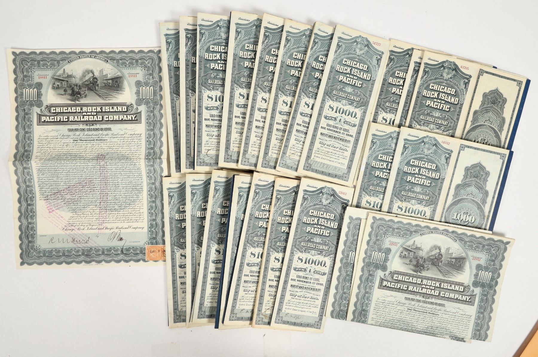 Lot of 29. I/U, Issued 1902 . Fine cond. Chicago, Rock Island And Pacific Railroad Co, $1000, 4% gold bearer bond, coupons attached. American BNC printer.