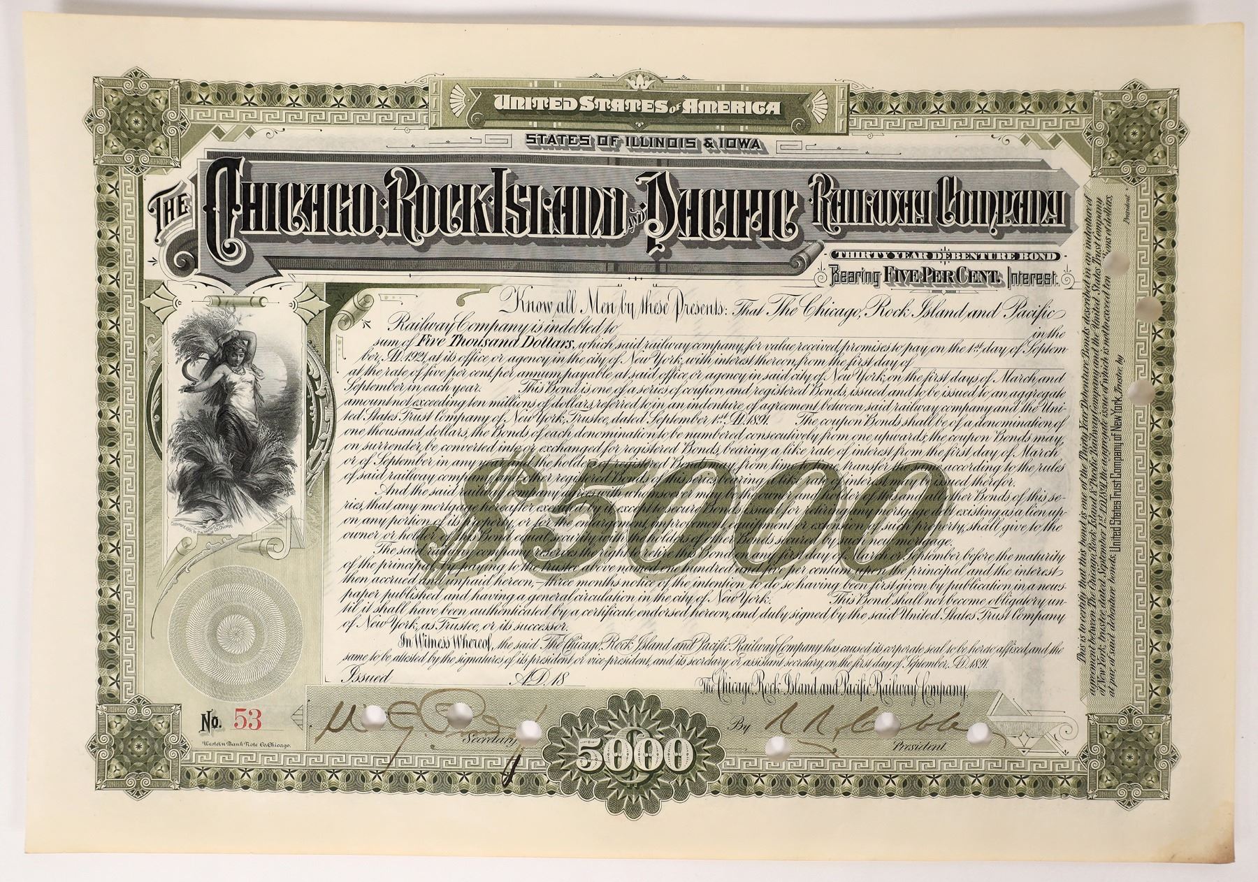 Chicago Rock Island and Pacific Railway Co, Incorp Illinois and Iowa, 30 year debenture Bond, No. 53, $5000, signed by president and secretary (illegible) 1891, 14x10", i/c, 1 cert