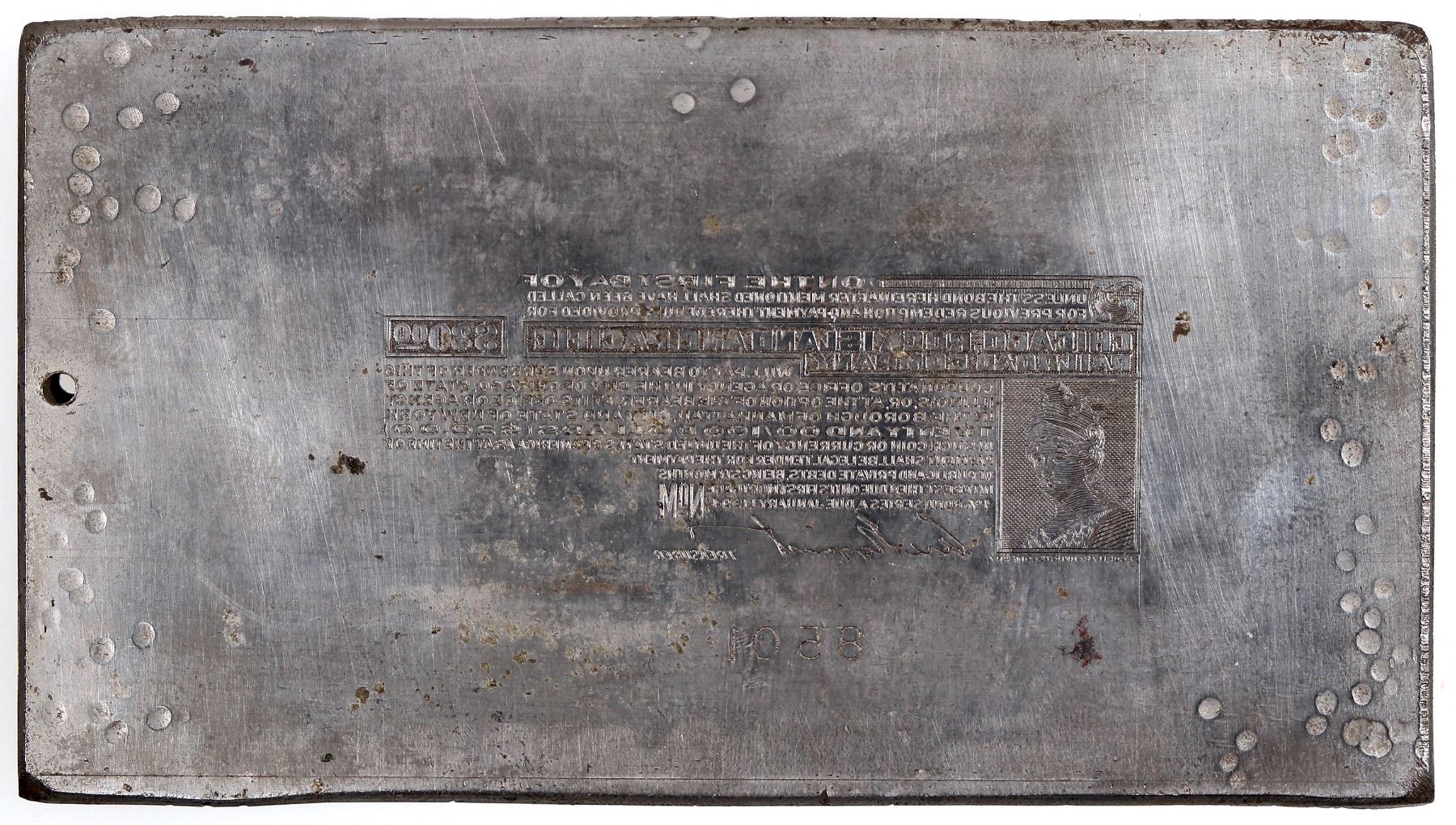 Steel printers plate for a bond coupon for The Chicago Rock Island & Pacific Railroad. Security Banknote Co. Redeemable for $20 in gold coin. Bond is due in 1994. Vignette of a woman. Signed by the treasurer. Identifying number on plate is 8501. Two dents on the bottom reverse of plate (likely from heavy use).