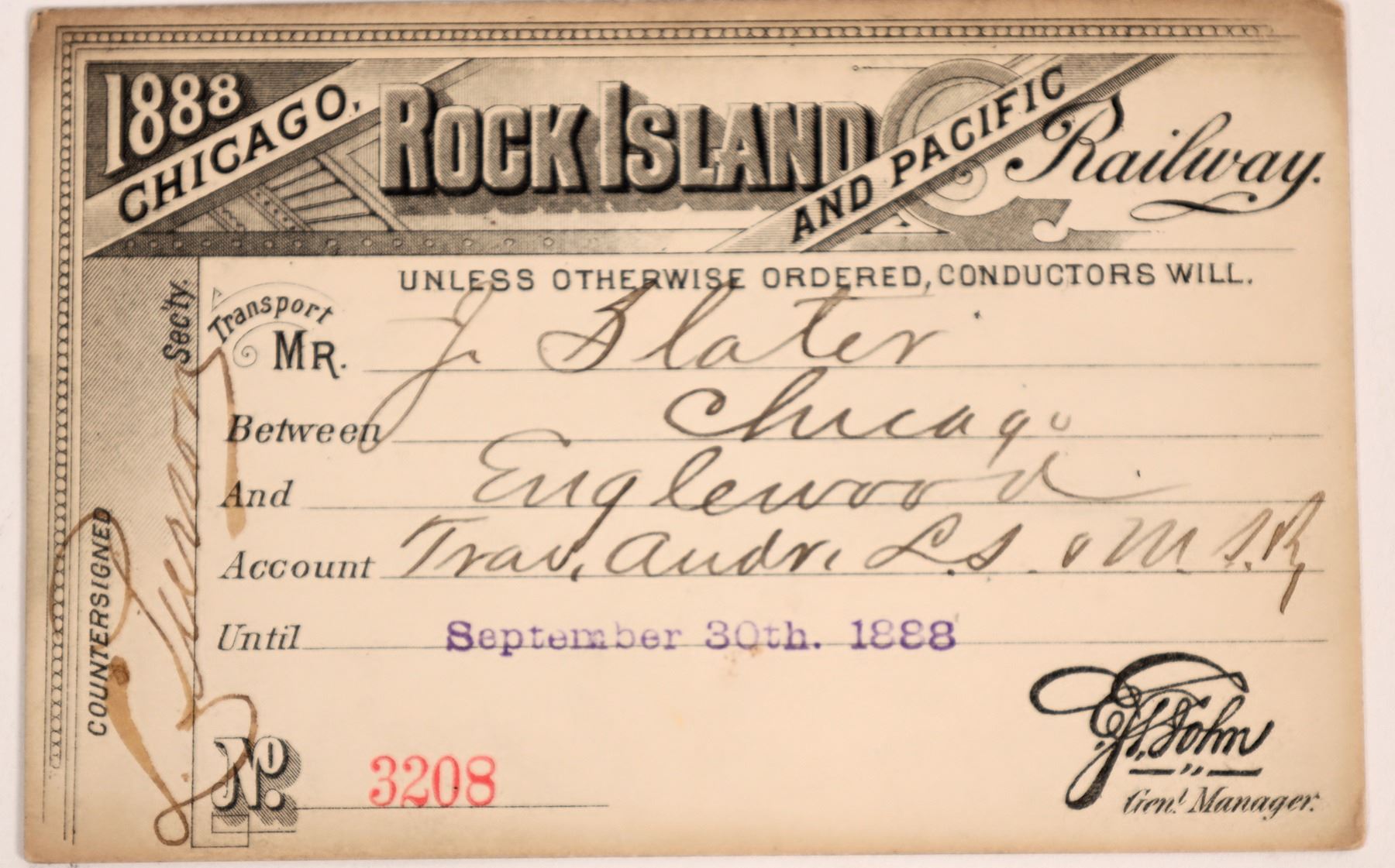 Pass no. 3208, issued to J. Slater in 1888 for passage between Chicago and Englewood. Preprinted signature of general manager John. Countersigned and endorsed. Ornate logo, black print on cardstock. Very good condition. This famous railroad operated 1852-1980 in Arkansas, Colorado, Illinois, Iowa, Kansas, Louisiana, Minnesota, Missouri, Nebraska, New Mexico, Oklahoma, South Dakota, Tennessee, and Texas.