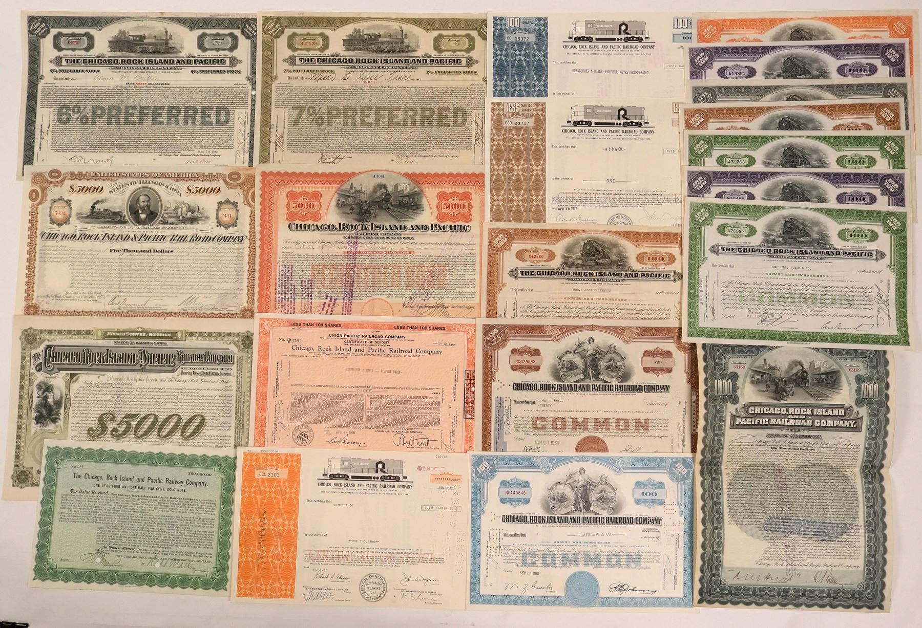 1) Ten issued common and preferred stocks from the 1930's and 40's. All I/U. 2) Two preferred stocks issued in 1920 and 1929. I/U. 3) Three later date common stocks issued between 1977-80. Punch cxled. 4) $50,000, 1 Yr. gold note issued 1904. 5) Cert. of Deposit for 3 shares dated 1966. Cxled. 6) 1902 Gold bond, due 2002, $1,000. Green. Black on creme. Full page of coupons. 4%. Man pushing cart toward train. Cancelled. 7) Three, $5,000 bonds, orange, brown and olive. Orange bond was issued in 1910 and cxled. The other two are unissued, one of them signed.