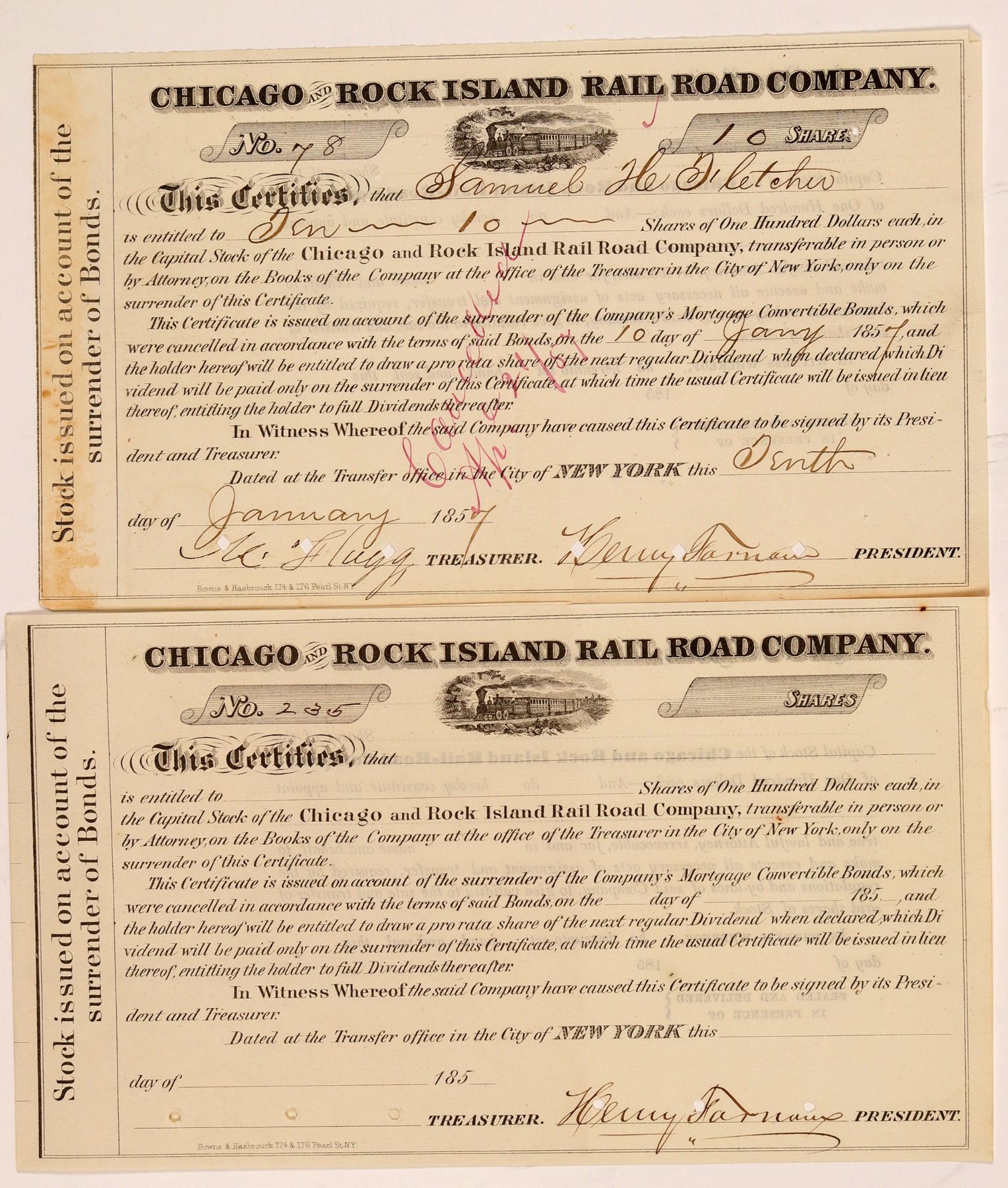 2 cancelled stock certificates for Chicago and Rock Island Rail Road Co. 1) unissued with certificate # 235. 2) Cancelled 10 shares certificate #78 dated Jan. 10, 1857, issued to Samuel H. Fletcher signed by president and treasurer. Printed: Bowne & Hasbrouck 174 & 176 Pearle St. NY. The predecessor to the Rock Island and La Salle Railroad Co was incorp. in Illinois on Feb. 27, 1847 and an amended charter was approved on Feb. 7, 1851, as the Chicago and Rock Island Railroad. Construction began Oct. 1, 1851, in Chicago. 1st train was operated on Oct. 10, 1852, between Chicago and Joliet. Construction continued on through La Salle. Connected to Rock Island on Feb. 22, 1854. It became the 1st railroad that connected Chicago with Mississippi River.