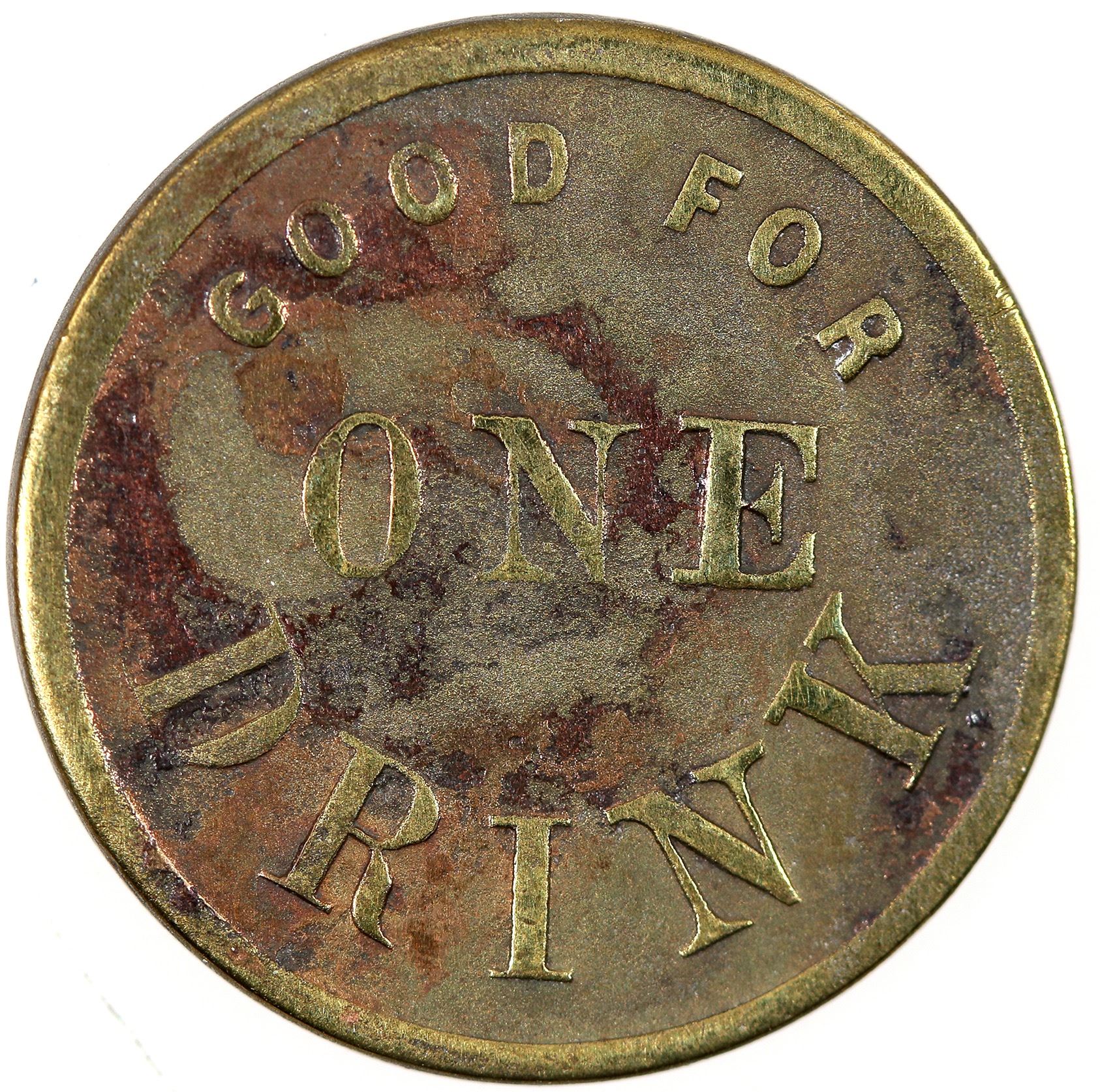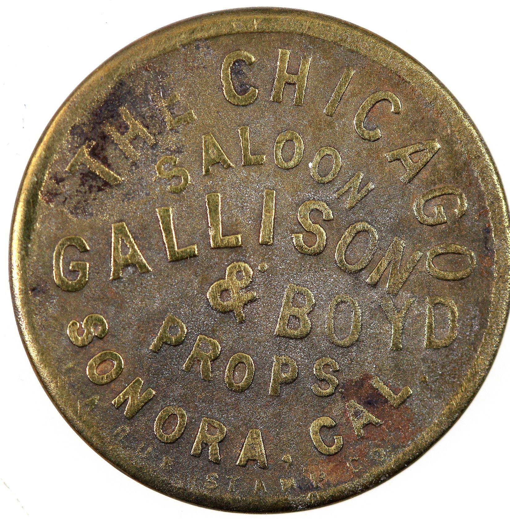 THE CHICAGO / SALOON / GALLISON / & BOYD / PROPS / SONORA, CAL. / L.A. RUB. STAMP CO. // GOOD FOR / ONE / DRINK; Br. rd., 21 mm. Tokencatalog.com reports: Percy Richardson Gallison (b. 1864, d. 1936, buried in Sonora). 1900 & 1910 Sonora Census lists as him as Saloon Keeper. No info found on Boyd.
