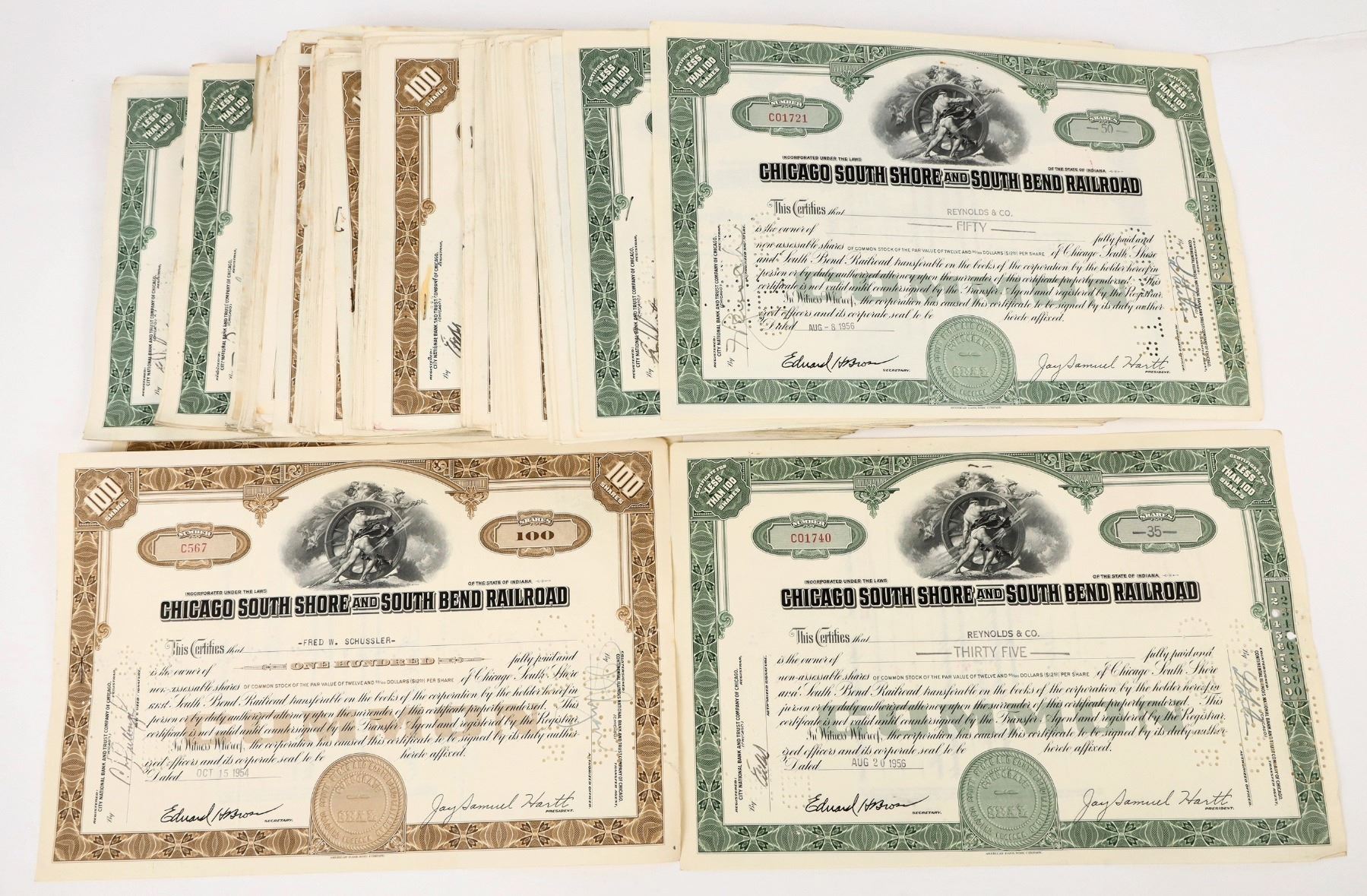 Large group of stocks, approx. (300) issued by the "Chicago South Shore and South Bend Railroad." Operating Class III freight and passenger lines between Chicago and South Bend Indiana, the railroad was noted for using electric locomotives. Two variants in this group, green certificates for less that 100 shares, and brown notes for 100 shares. Central vignette, intricate borders. These are fully signed, countersigned and punch cancelled. Reverse sides are fully executed with signatures and stamped. Certificates measure 12"x8", and are in very good to excellent condition. Some exhibit minor corner folding, some staples, etc. Please see photos for details.