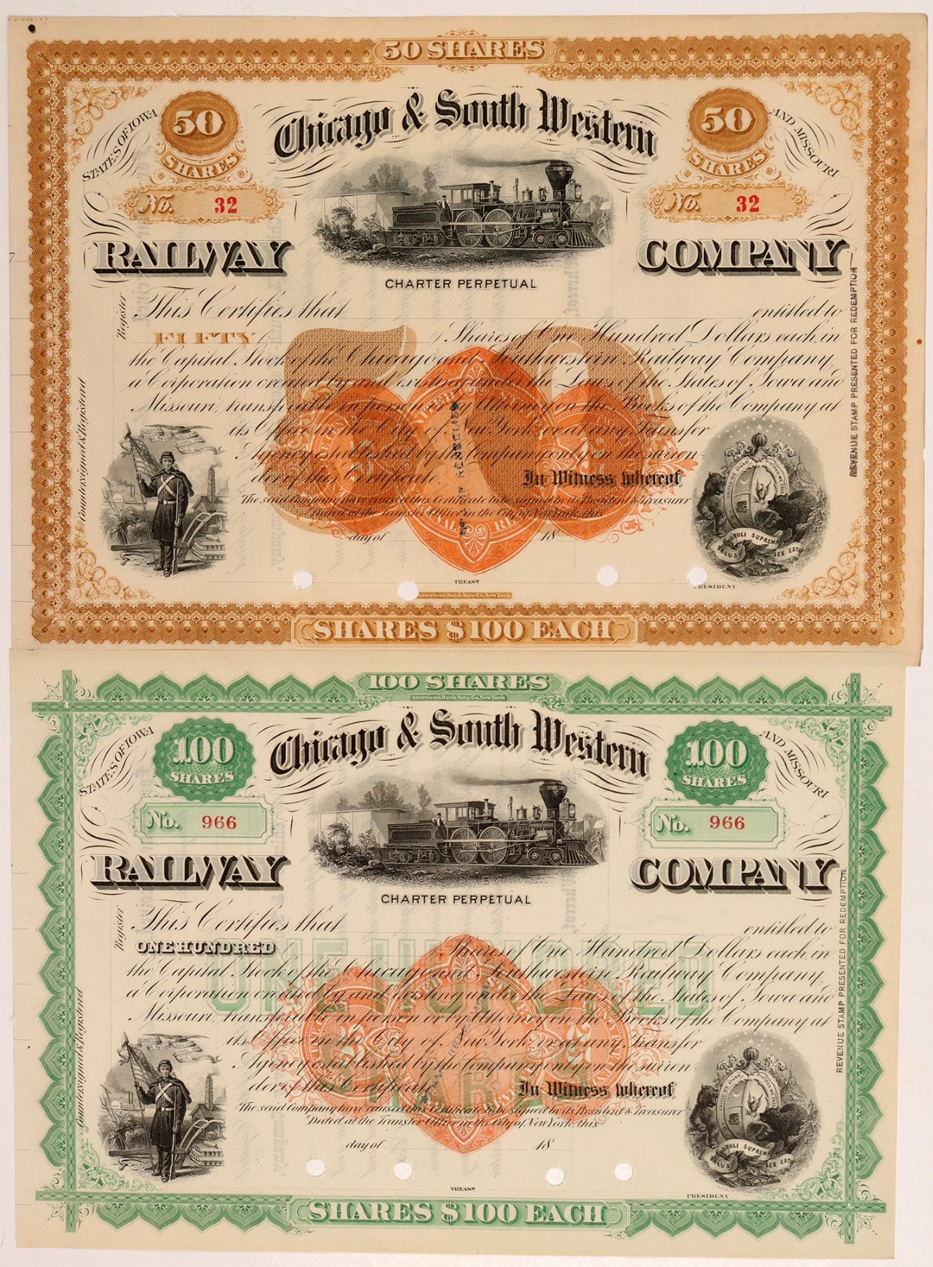 2 cancelled and unissued stock certificates @ $100 each share of Chicago & South Western Railway Co. 100 shares certificate #966 (green border), 50 shares certificate #32 (brown border). Both have imprinted orange revenue stamps in middle of certificate. Both in good condition with very nice vignettes, train on track on top center, Civil War soldier on left bottom and coat of arms with bears on bottom right. Countersigned and registered. Railroad started as Platte City and Fort Des Moines Railroad Co on Feb 12,1864. Name changed to Leavenworth and Des Moines Railway Co on Aug 3,1867. Changed again to Chicago and Southwestern Railway Co on March 3, 1869 and then to Chicago and South Western Railway Co on May 21,1869. Finally became part of the Chicago Rock Island Railroad.