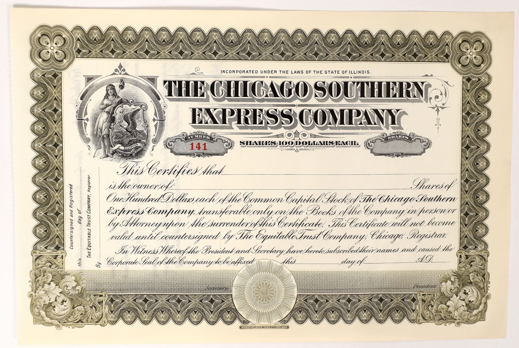 Chicago Southern Express Co, Stock, Incorp Illinois, No. 141, u/i, u/c, unsigned, 19XX, 11x8", 1 cert