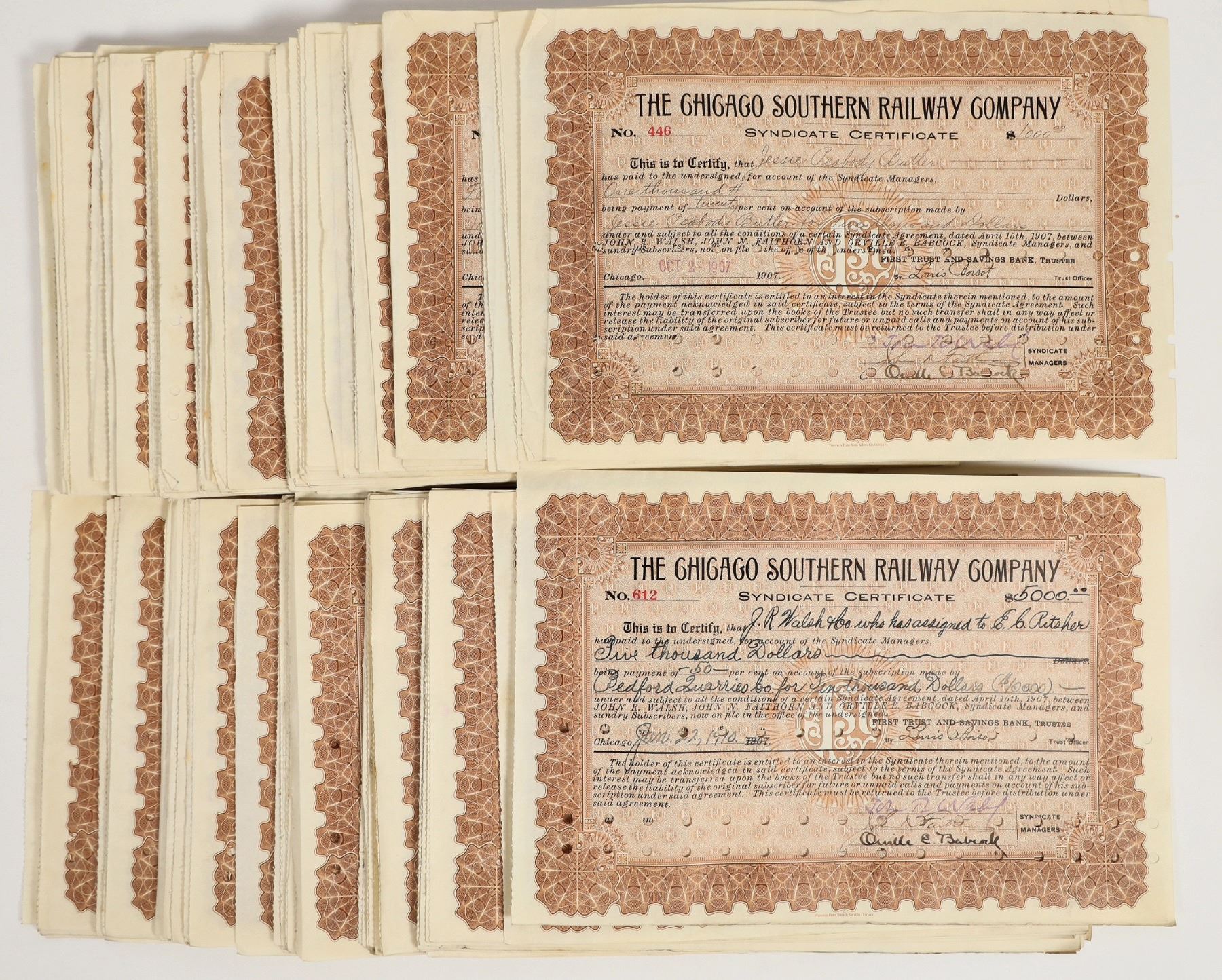 About 140 stock certificates issued by Chicago Southern Railway Company. Brown ink.