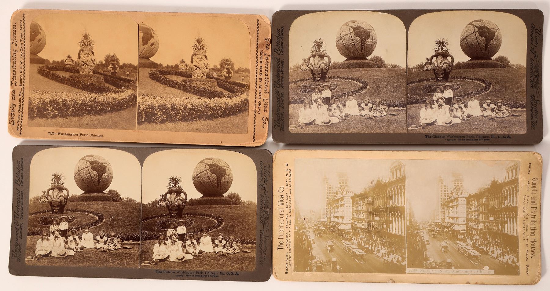 4 Chicago stereoviews. 2x Globe at Washington Park by Underwood, State St. by Intl. View, Washington Park by Intl. View.