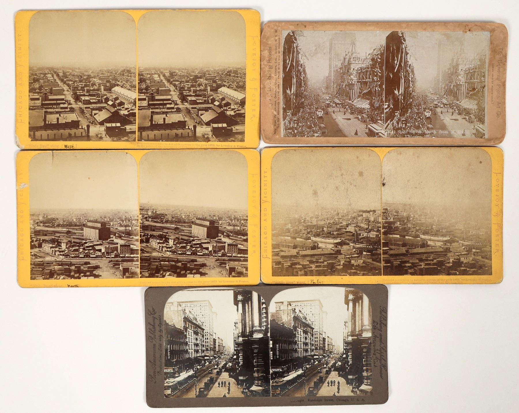 Lot of 5 different. 1-3) Three 1873 birds-eye views, pre-fire, looking West, East, and North East. All by Lovejoy & Foster. 4 and 5) Two c.1900-1910 views, Randolph Street (Pan American Publishing Co.) and State Street patriotic celebration (Universal Photo Art Co.).