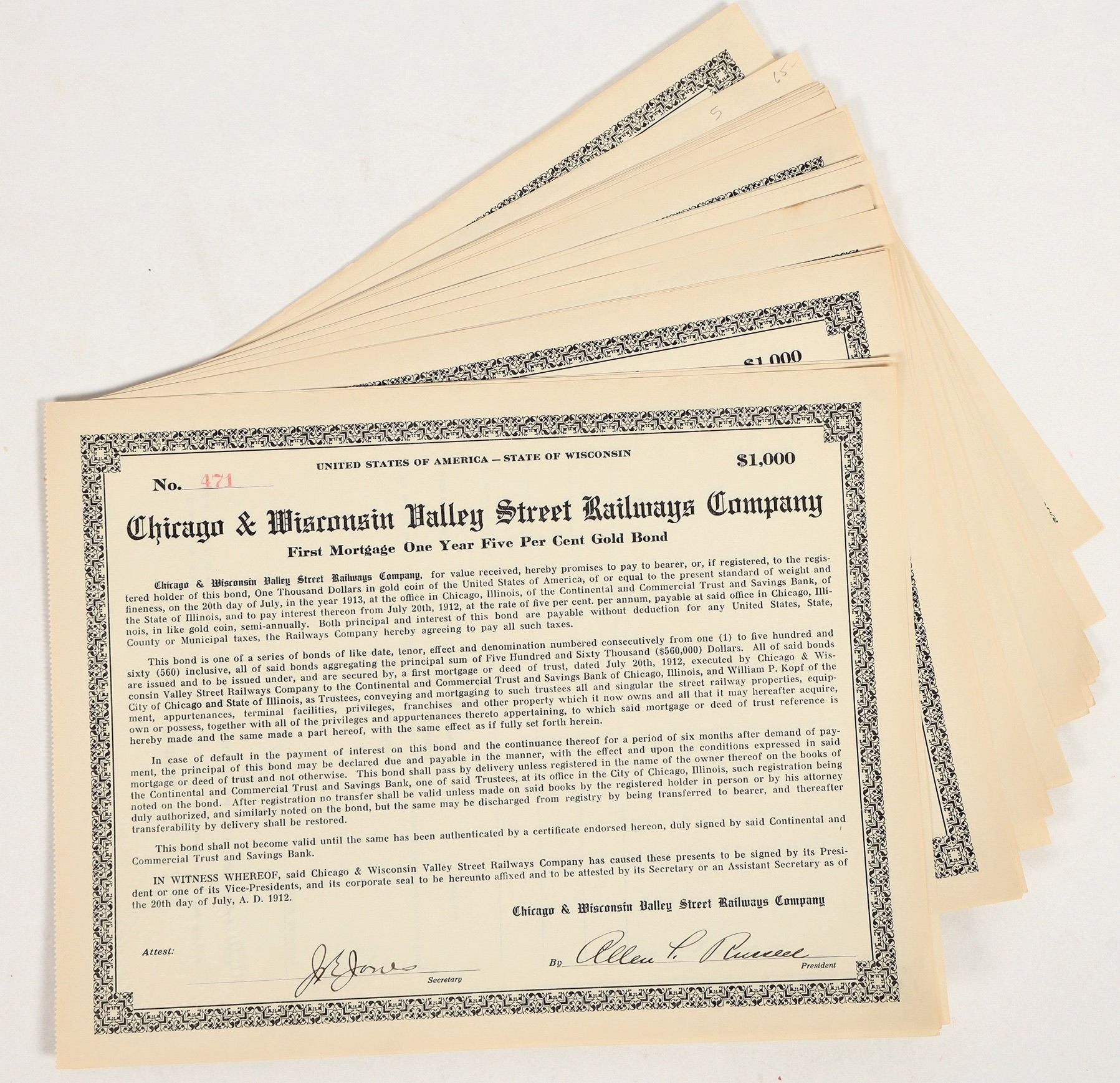 Lot of 22. I/U. Issued 1922. EF cond. Chicago & Wisconsin Valley Street Railways Co., $1000, 5 % gold bearer bonds. Unk. printer.
