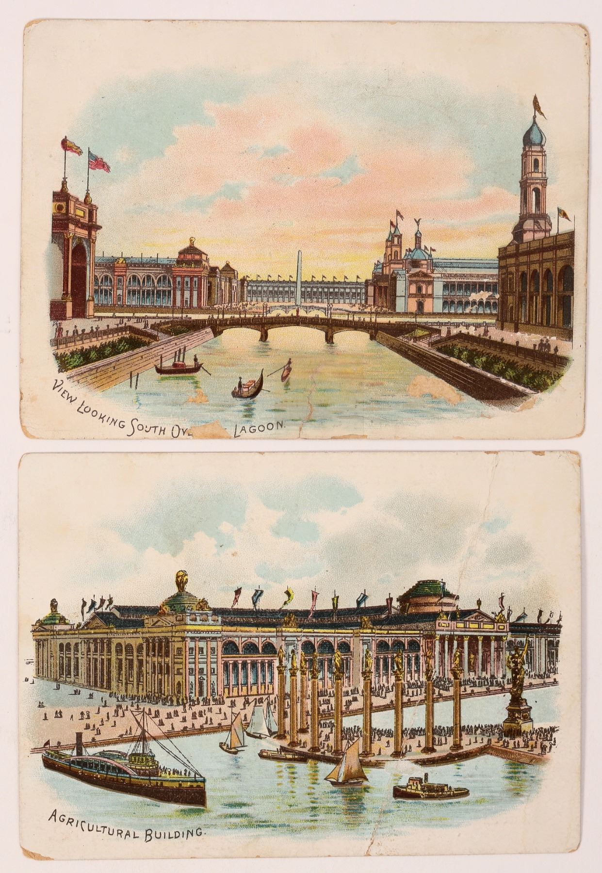 A pair of trade cards featuring color illustrations of the 1893 World's Columbian Exposition, also known as the Chicago World's Fair, with advertisements on verso for The Bucher & Gibbs Plow Co., Canton, Ohio. Illustrations include the "Agricultural Building" & "View Looking South Over (the) Lagoon." One has a vertical fold, both have worn areas on fronts & corners, & light staining. [Chicao Illinois