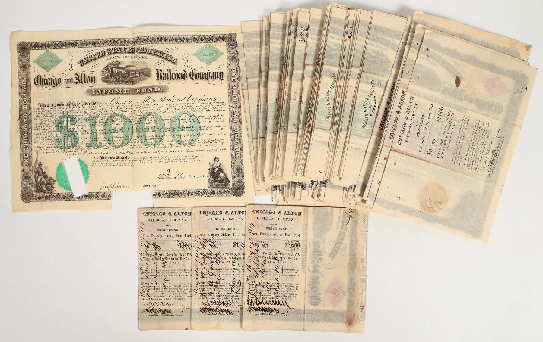 This group of bonds was issued by the Chicago and Alton Railroad Company in 1862. Over 100 bond issues. Please see photo for details.