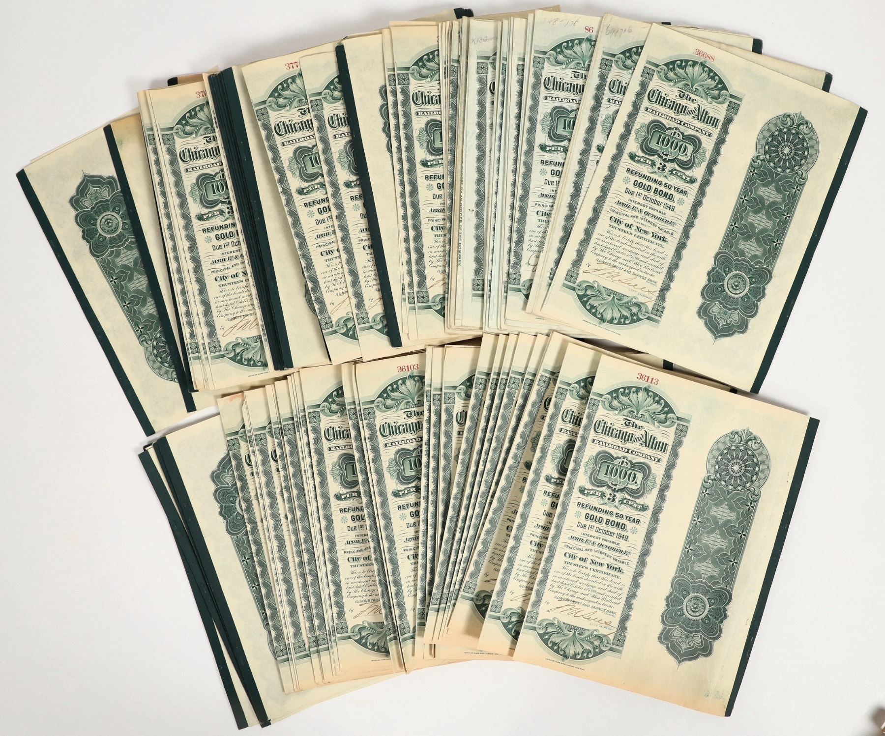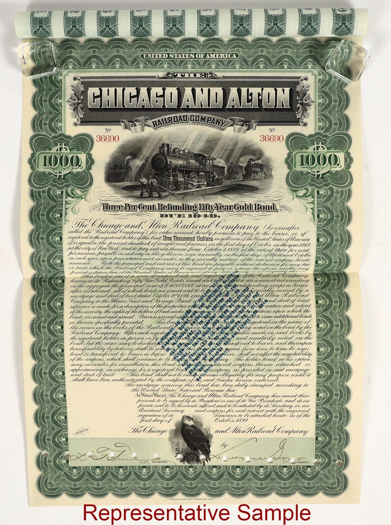 Over 100 Fifty Year $1000 Gold Bonds issued by The Chicago and Alton Railroad Company. Railroad and eagle vignettes, coupons on a separate page, green ink.