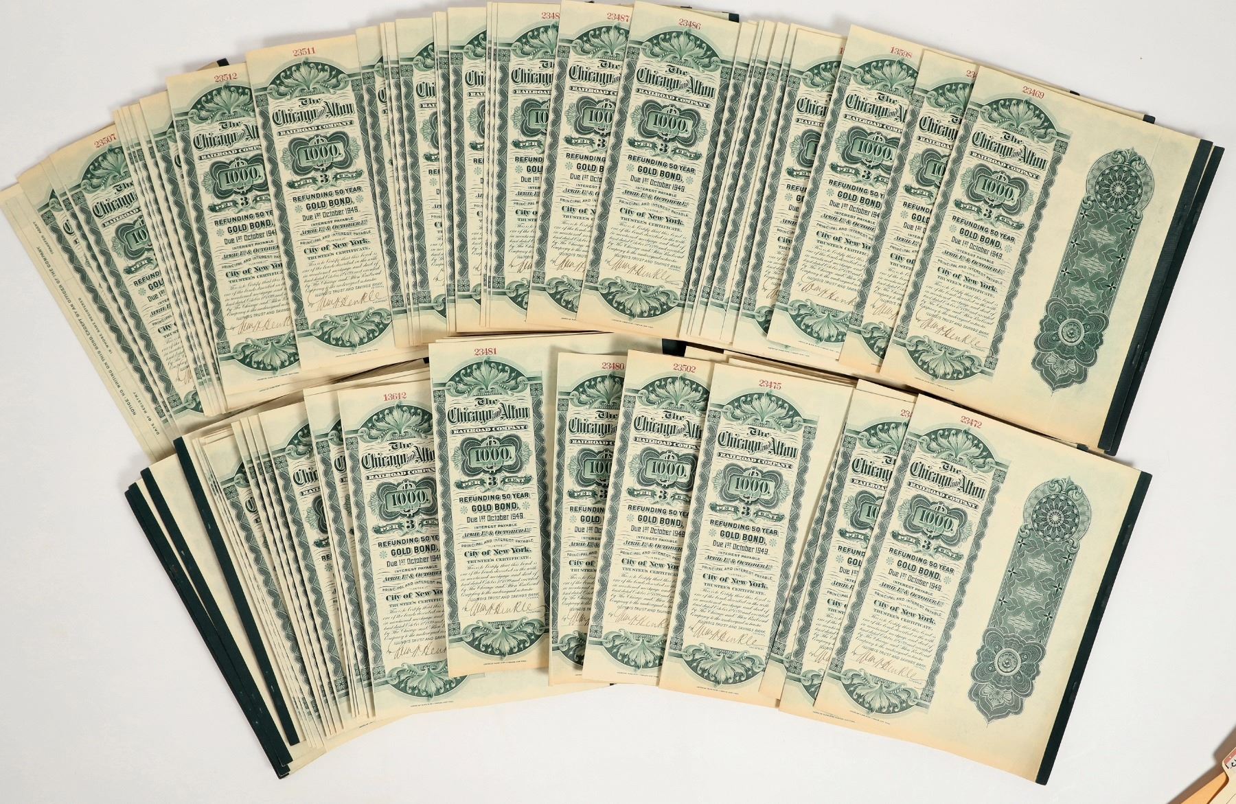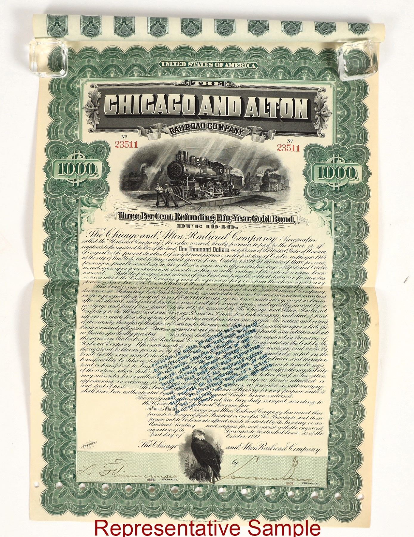 About 100 $1000 gold bonds from The Chicago and Alton Railroad Company. Railroad and eagle vignettes; 10 x 14 inches with coupons on a separate page.