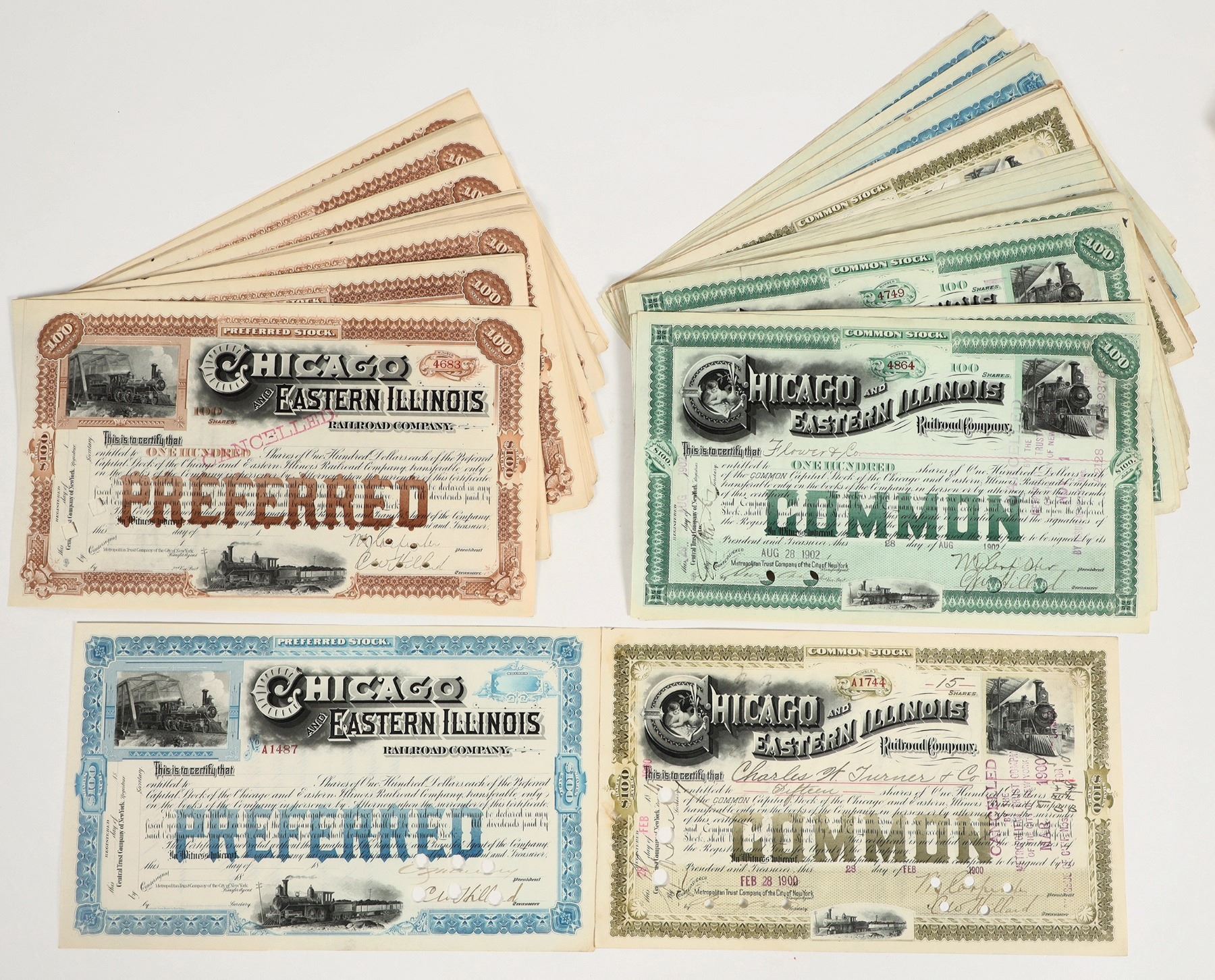 About 60 stock certificates from the Chicago and Eastern Illinois Railroad. About 30 issued and about 30 unissued, cancelled. Green, blue and brown ink, railroad vignette.