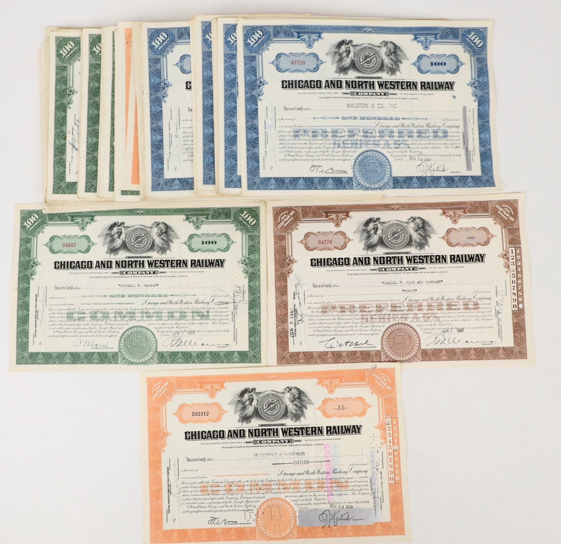 Lot of approx. (+200) "CHICAGO AND NORTH WESTERN RAILWAY" stock certificates. (3) variations in this large group, all punch cancelled. Classic vignette at top, signed and countersigned by Trust companies from New York. Definitive fine print on the reverse, excellent condition overall. Please see photos.