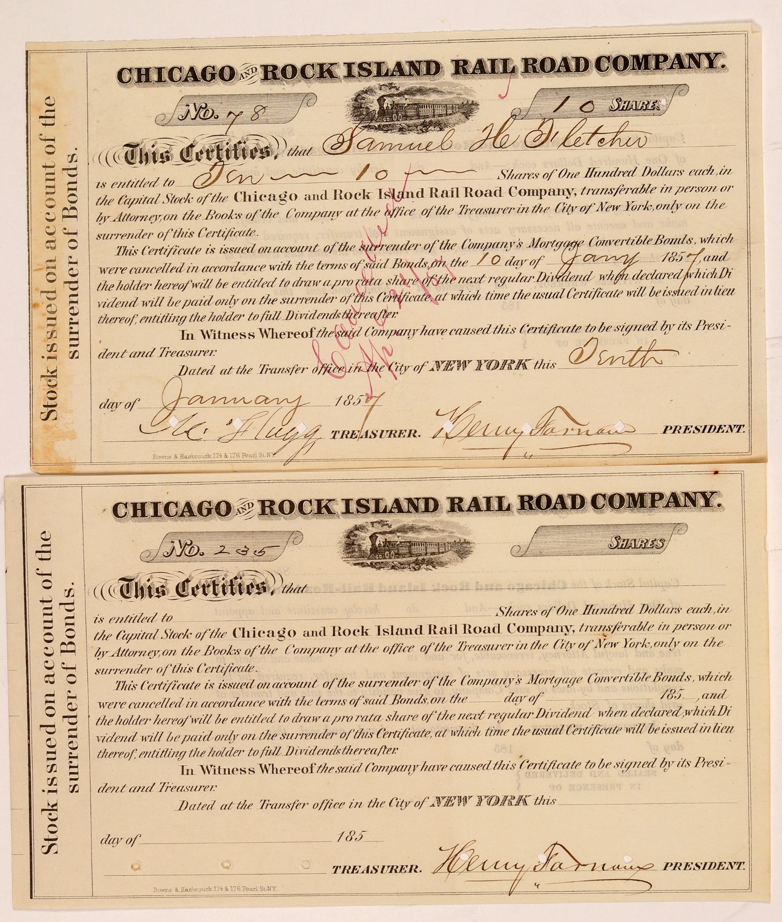 2 cancelled stock certificates for Chicago and Rock Island Rail Road Co. 1) unissued with certificate # 235. 2) Cancelled 10 shares certificate #78 dated Jan. 10, 1857, issued to Samuel H. Fletcher signed by president and treasurer. Printed: Bowne & Hasbrouck 174 & 176 Pearle St. NY. The predecessor to the Rock Island and La Salle Railroad Co was incorp. in Illinois on Feb. 27, 1847 and an amended charter was approved on Feb. 7, 1851, as the Chicago and Rock Island Railroad. Construction began Oct. 1, 1851, in Chicago. 1st train was operated on Oct. 10, 1852, between Chicago and Joliet. Construction continued on through La Salle. Connected to Rock Island on Feb. 22, 1854. It became the 1st railroad that connected Chicago with Mississippi River.