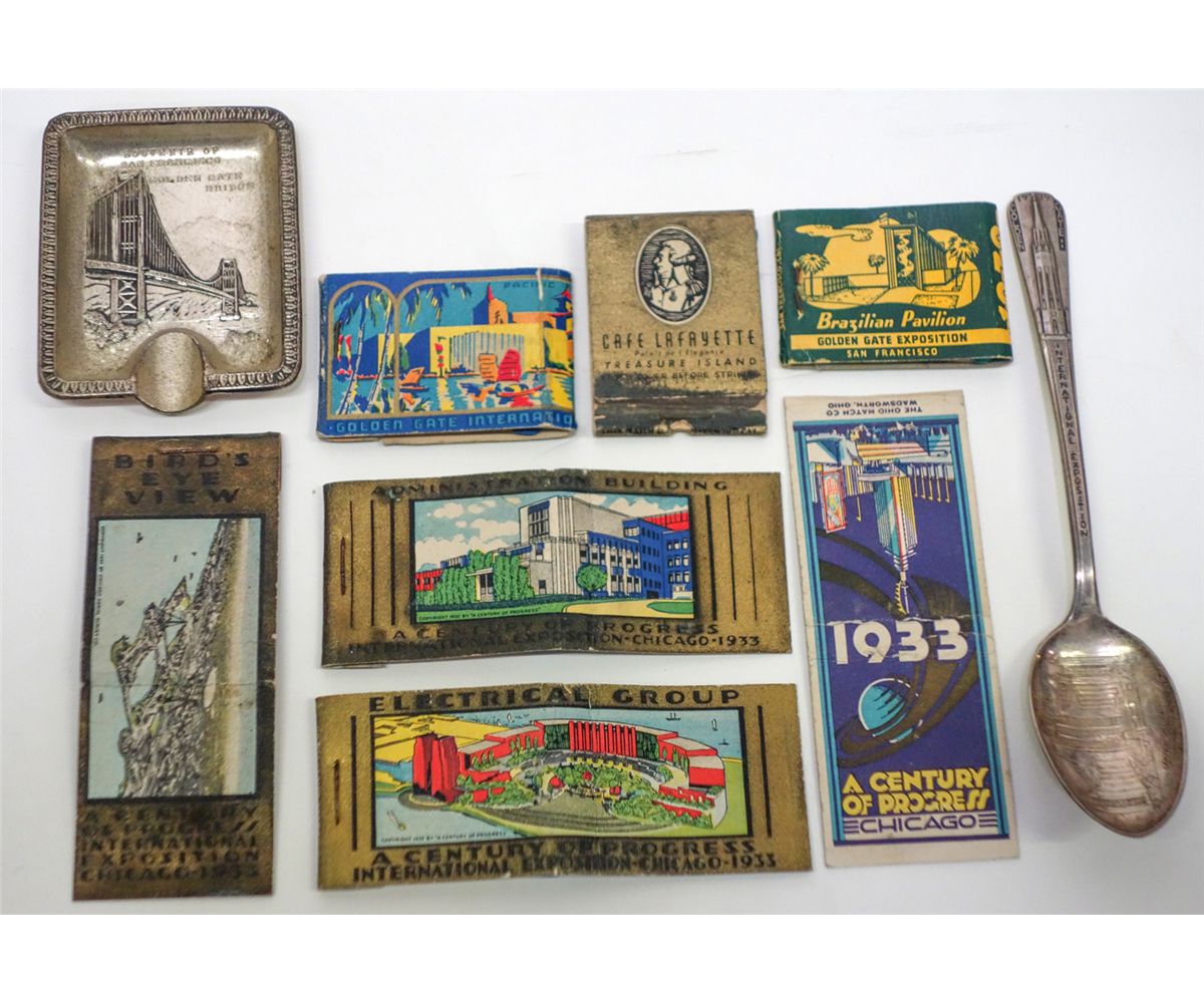 Group of 9 items from the Prag collection, including 4 matchbooks from the 1933 Century of Progress Chicago; and 3 matchbooks, a spoon, and an ashtray from the Golden Gate International Exposition 1939.