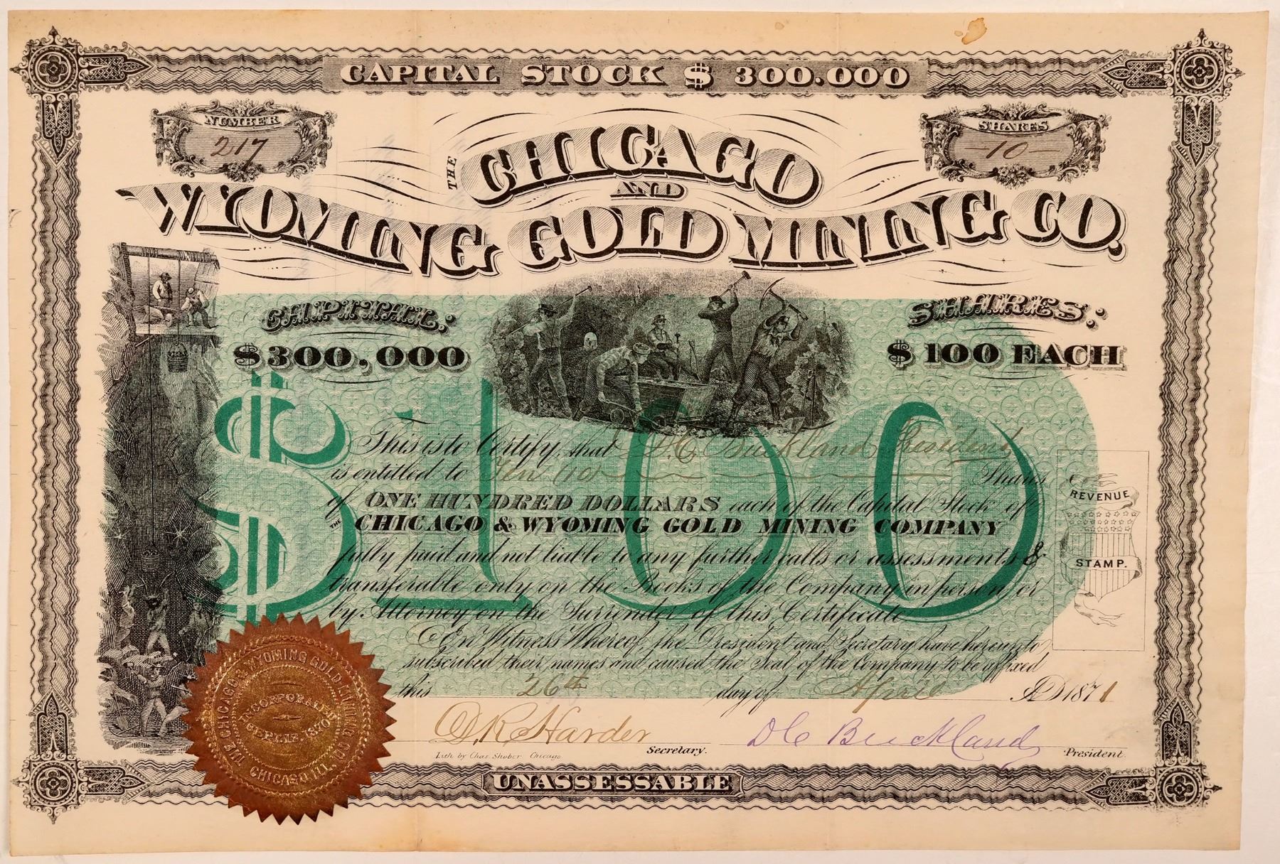 1871. Number 217 for 10 shares to D. C. Buckland signed by secretary AR Hardin and president Buckland. Printer: Charles Shober of Chicago. Stunning piece with two bold vignettes, gold seal, and green and white background. Uncanceled. From its discovery in 1842 up until 1869 the rich placer mines in the South Pass region were worked with great success. Some of the properties in the area were the Miners Delight at Peabody Hill and the Burr at Lewiston, along with others; eventually, however, the mines were abandoned due to water levels when the base ores were reached. We believe this company was formed by Chicago investors to locate and mine gold properties at South Pass. An Ohio group owned what was called The Young American. Most of the mines were financed by mid-western or British companies. At the end of the 1869 fiscal year it was estimated that $155,000 is gold was produced. That was enough to cause a small rush. The Carissa Lode was first discovered by H.S. Redall in 1867, and paid large returns. He and his partners were killed by Indians. "Indians murdered some of the best young men and miners within the very center of this eight miles of mines, and killed several other citizens in the valley...miners cannot work and at the same time watch and fight Indians." [pg. 375, Raymond, 1872].