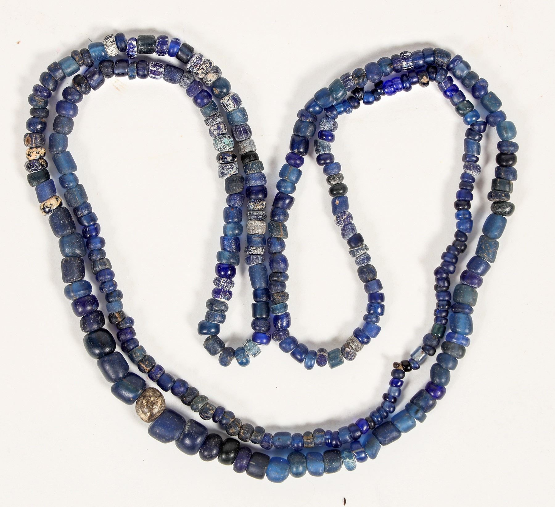 This is a necklace made from blue beads found at a pre-Columbian Chickasaw site in Mississippi. It is 30 in. in length. These beads are unique because they have no symmetry and are handmade. Please look closely at the photos for details.