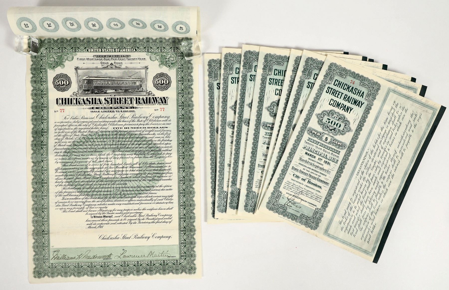 Eleven $500 twenty-year gold bonds issued by the Chickasha Street Railway Company in 1931. Green ink, coupons included; street car vignette.