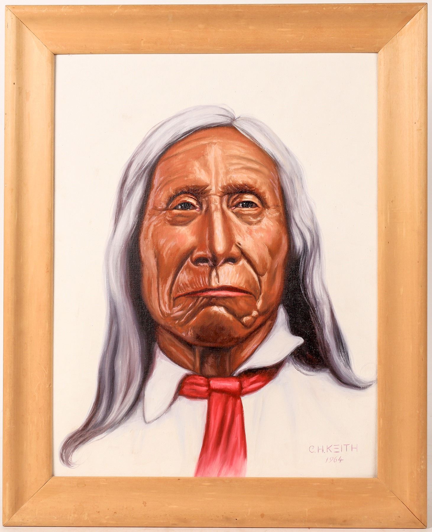 Framed original acrylic painting of Chief Red Cloud by Lakota painter Cecil Hobart Keith. Signed in lower right corner, CH Keith, and dated 1964. "Art critics have said that Hobart Keith's portrayals of horses are among the best to be found anywhere in the world. Keith became interested in art as a young boy growing up on the Pine Ridge Reservation near Martin, South Dakota. While art was his passion, Keith also served for many years as the chief judge of the Oglala Tribe." from crazyhorsememorial.org. Painting 18x13.5"
