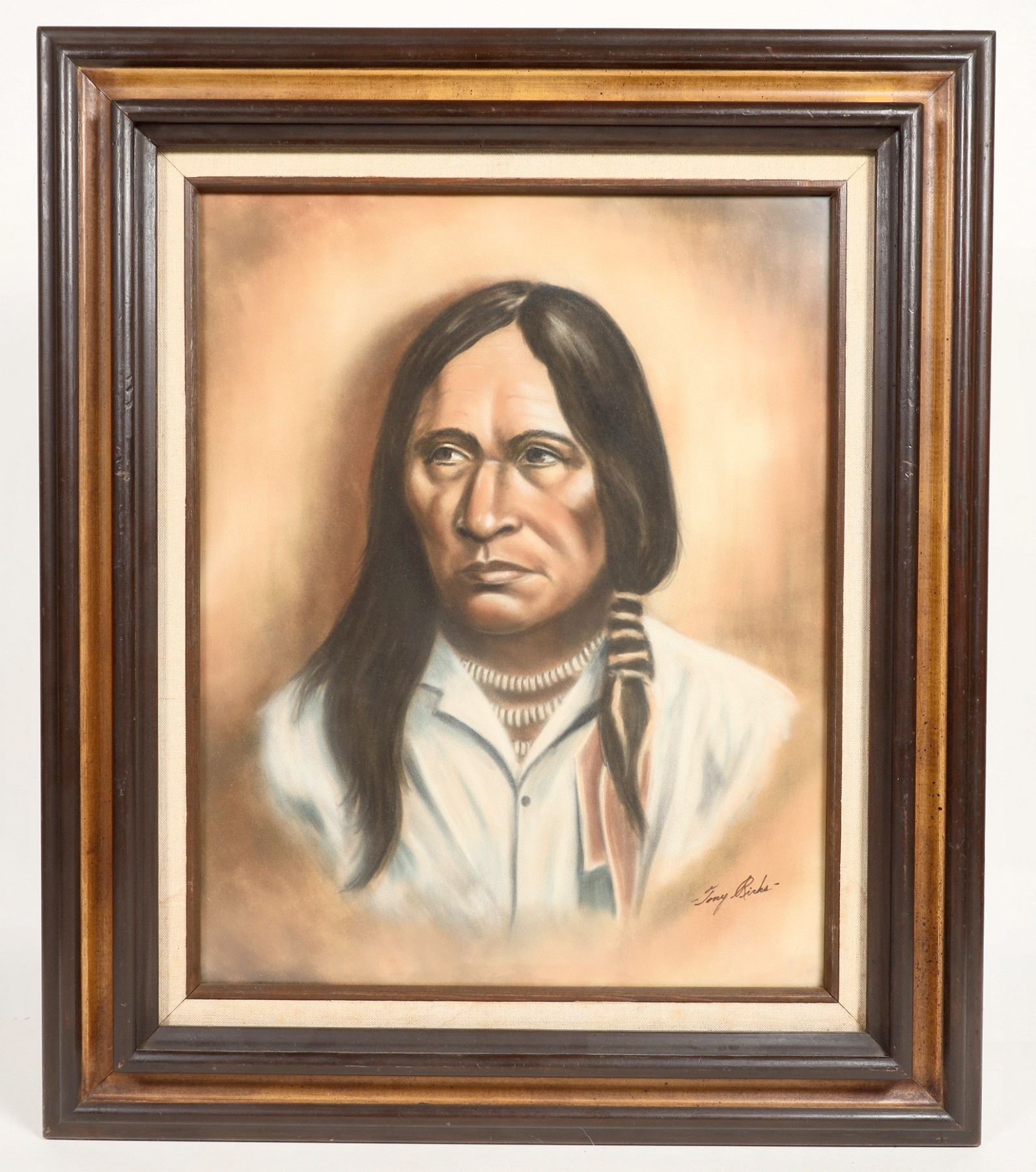 Chief Sitting Bull airbrush portrait by artist Tony Ricks. Google A.I. states this is a younger version of Sitting Bull. Google search regarding artist Tony Ricks revealed little biographical information. Nicely framed 23.5 x 27.5 ". Painting 16 x 20".