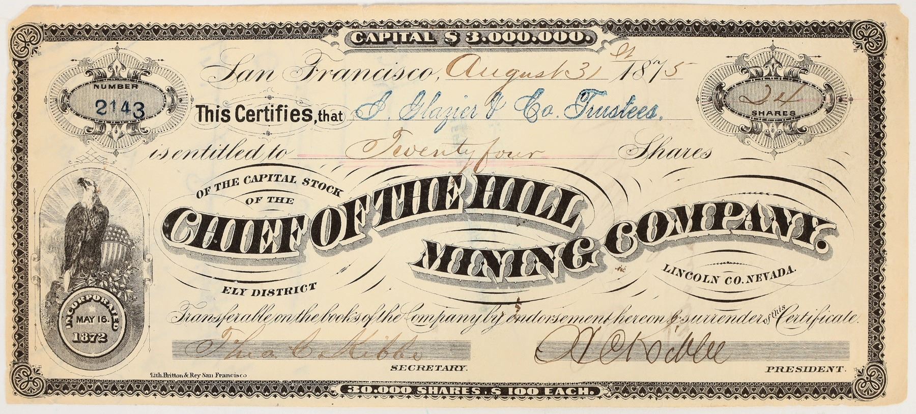 "Ely District, Lincoln Co. Nevada" printed under title. Inc. May 1872. No. 2143, issued for 24 shares in 1875. Signed by president and secretary Kibbe. Not cancelled. Eagle with shield vignette. Britton & Rey. Folds, many pinholes, some discoloration. The Chief of the Hill mine was located about a mile south of Pioche, Lincoln County.