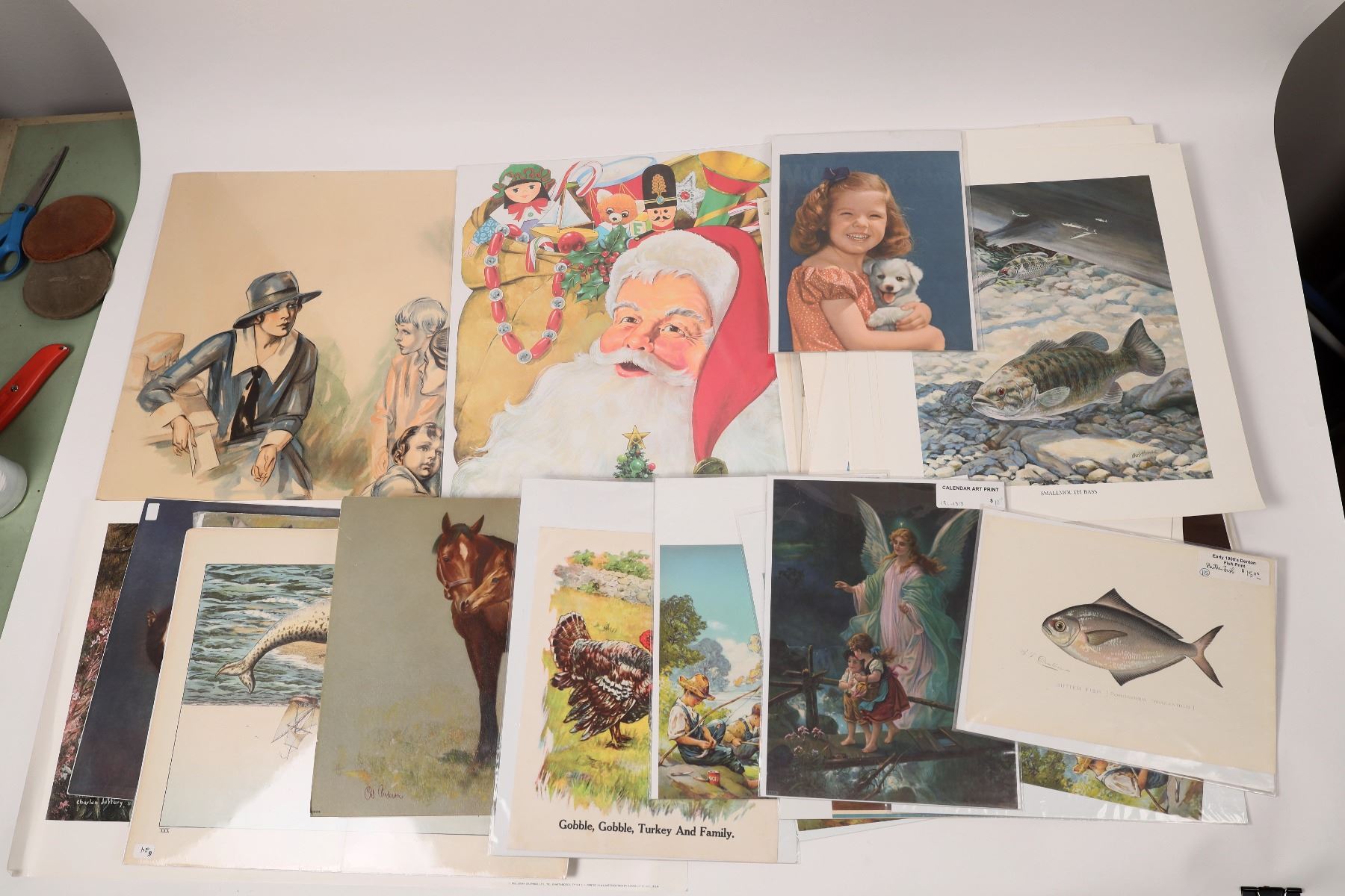Lot of 37 prints of children, animals and fish. Includes several calendar art prints. Largest item +/- 25" x 18", smallest +/- 11" x 8 1/2". Collection includes Cupid Asleep, by M.B. Parkinson, copyright 1897. Terrific presents in here for parents to give to their children.