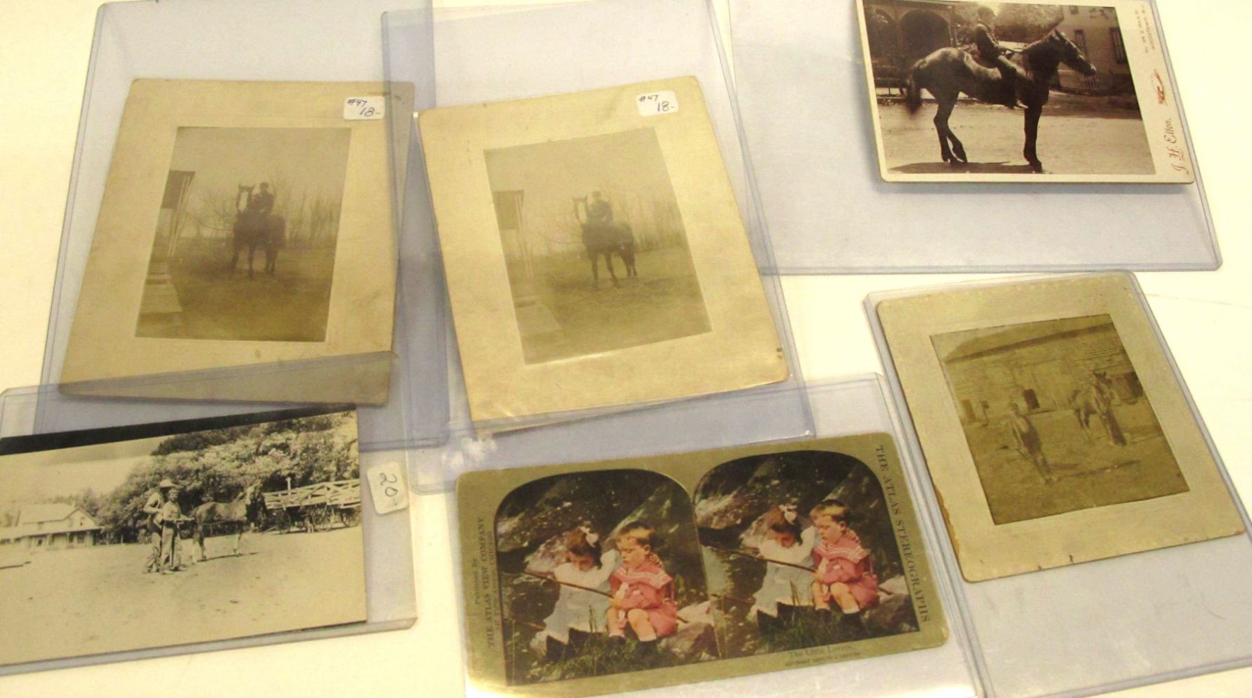 One stereoview by Atlas Stereographs "the Lovers"; one 5 X 7 by JH Elton of a young boy on horseback. Remaining cabinet cards are without identification.