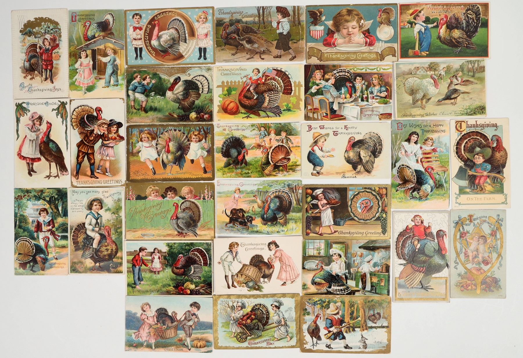 Thanksgiving vintage seasonal embossed postcards, no duplicates (group of 30). 1907-1918. Good condition, see photo. Measure 3.5x5.5".