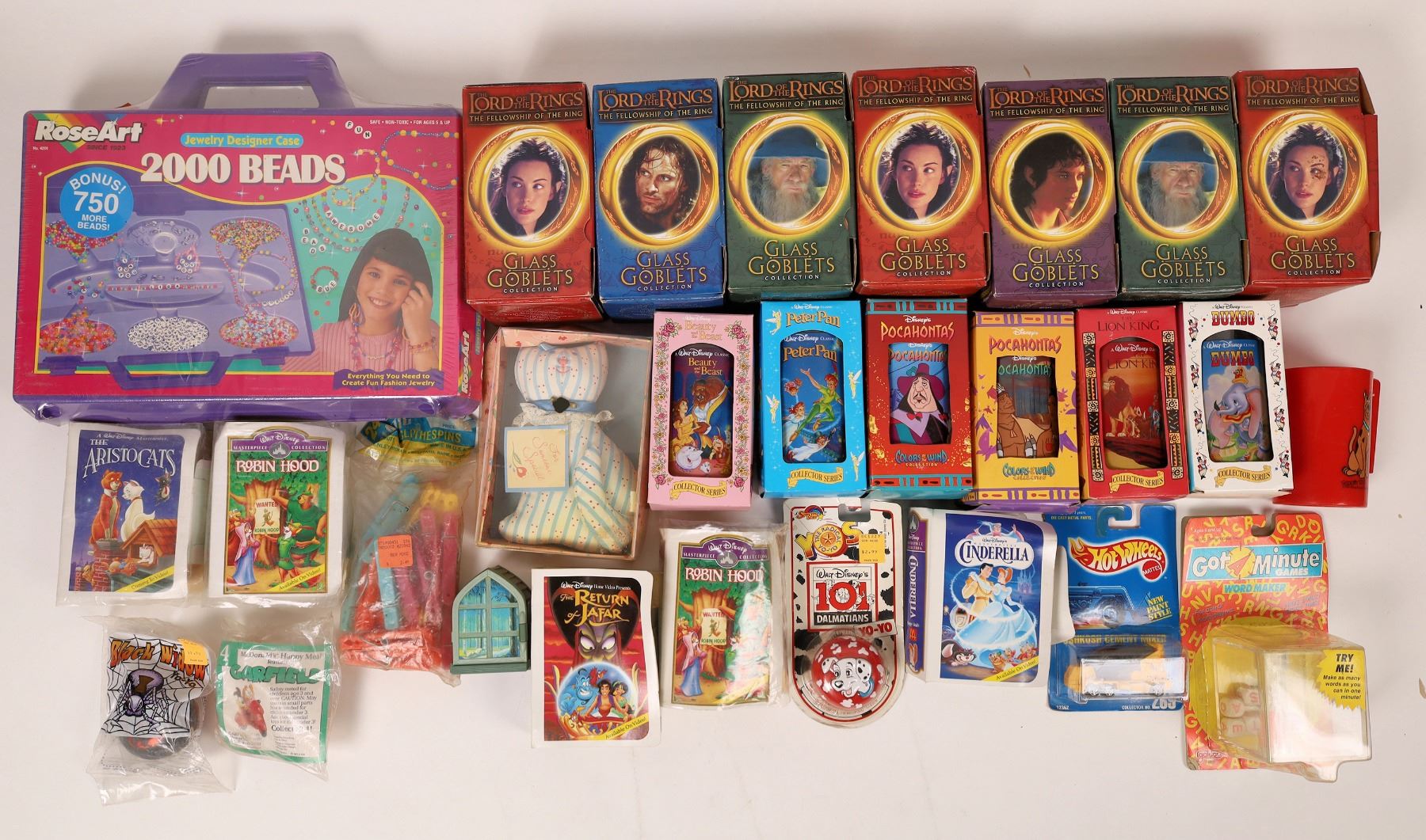 Collection of about 25 movie collectibles and toys. Includes: 7 Lord of the Rings glass goblets; 6 Disney collector series glasses; 5 Disney Happy meal toys in original boxes; miscellaneous toys mostly in original boxes