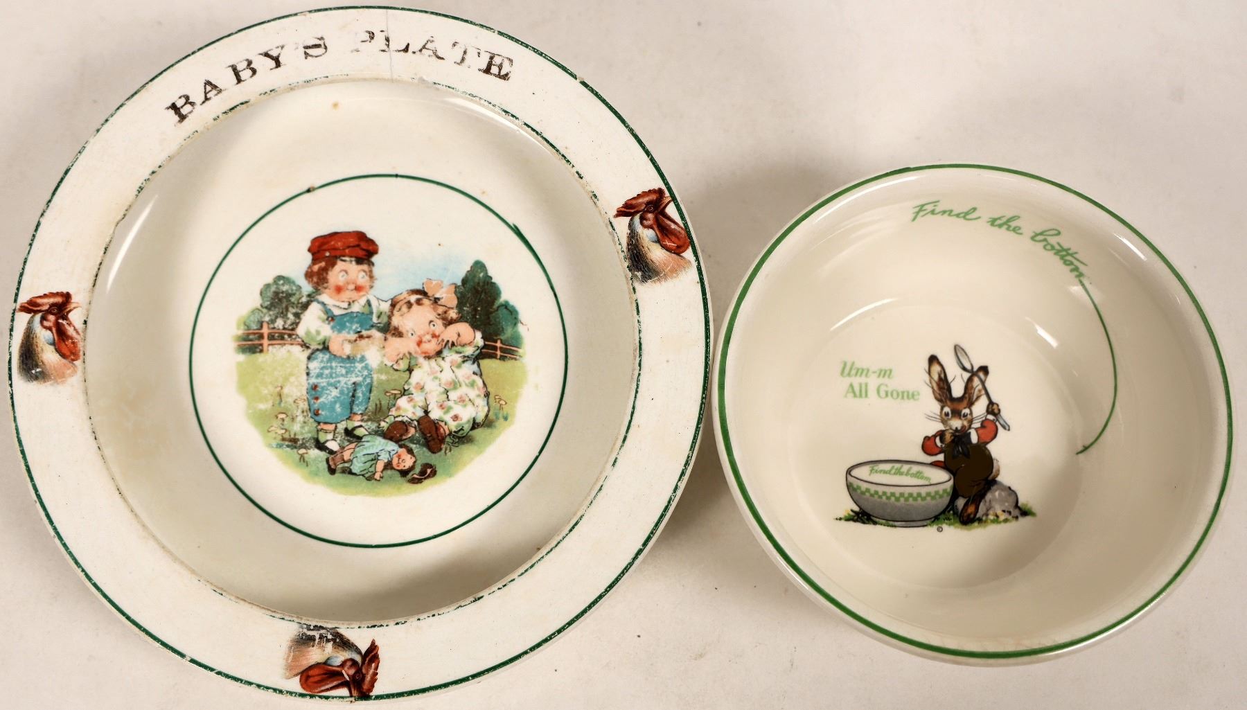 2 children's bowls. 1925 Ralston Purina-Find the bottom----Um-m All Gone, 1.75x5.25". Baby's Plate with top rim and applied roosters and bottom children with doll. Only a slight nick on bottom of Baby's Plate, no other apparent chips or cracks.
