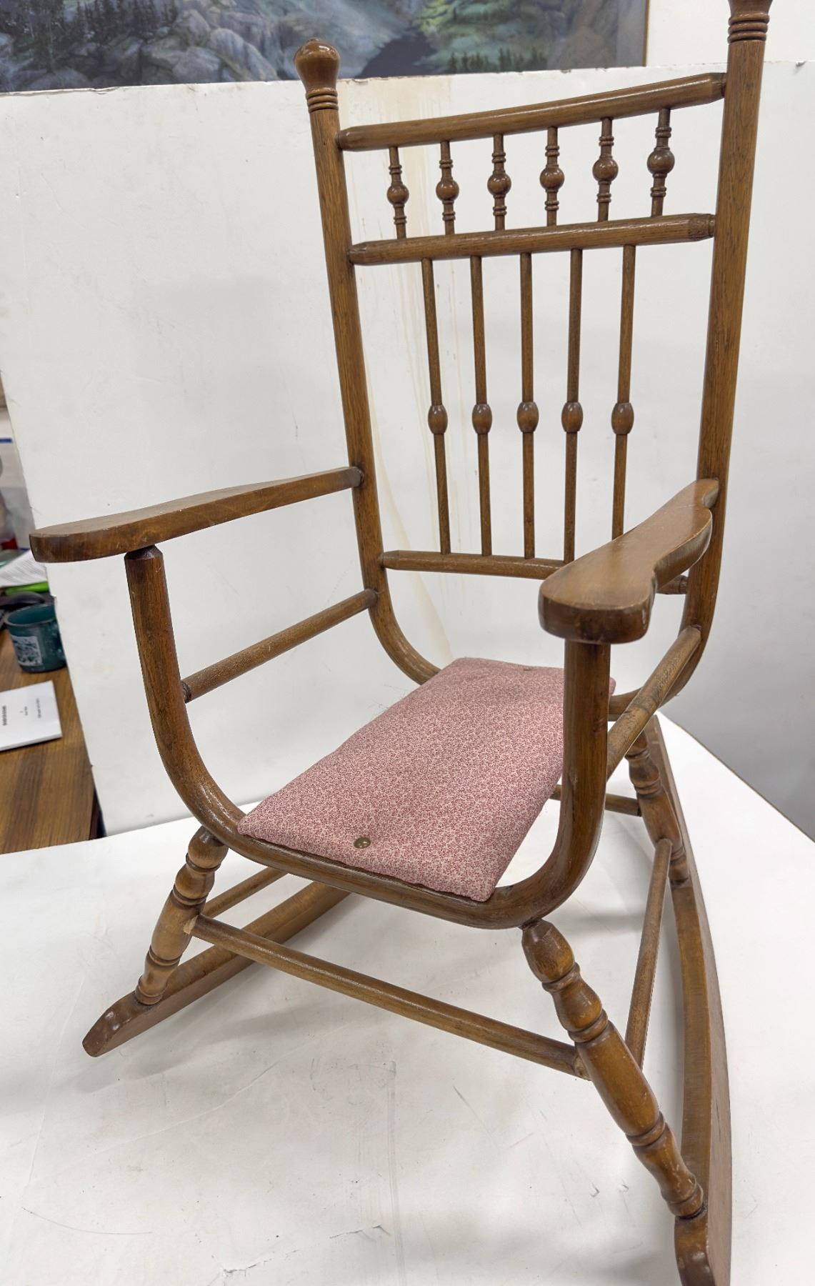 Antique wood children's rocking chair. No maker mark. Seat cover is probably not original. 30x20x26".