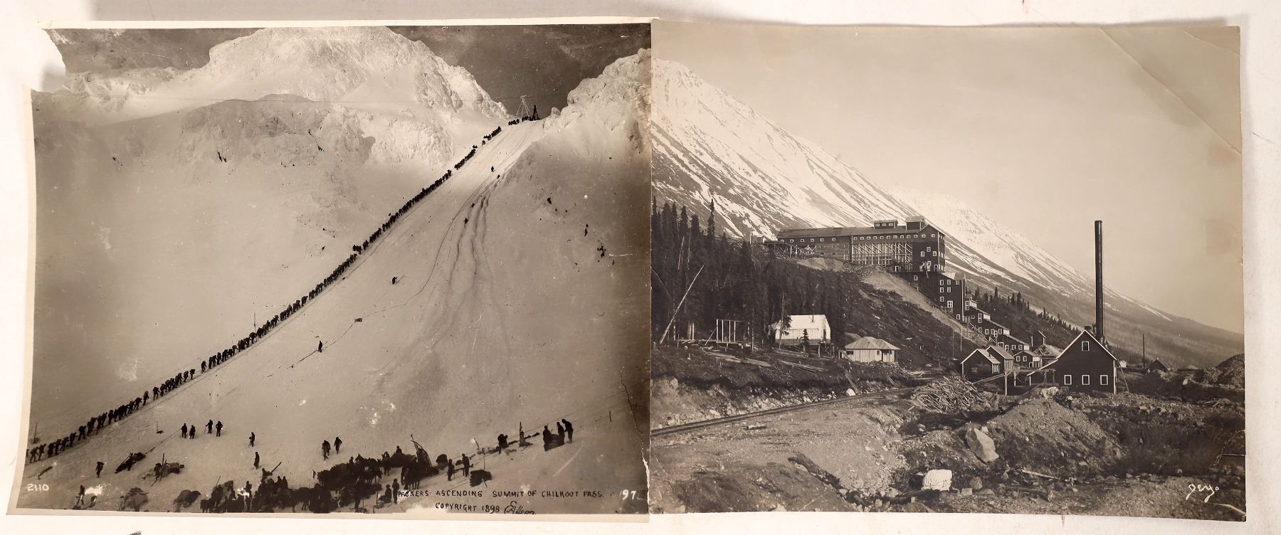 Early Alaska 8"x 10" photos. One shows 89ers making the trek up Chilkoot pass, the other shows the Kennedy family owned Bonanza Mine. There is a corner tear on the Chilkoot photo. Please see photos for more details. Alaska