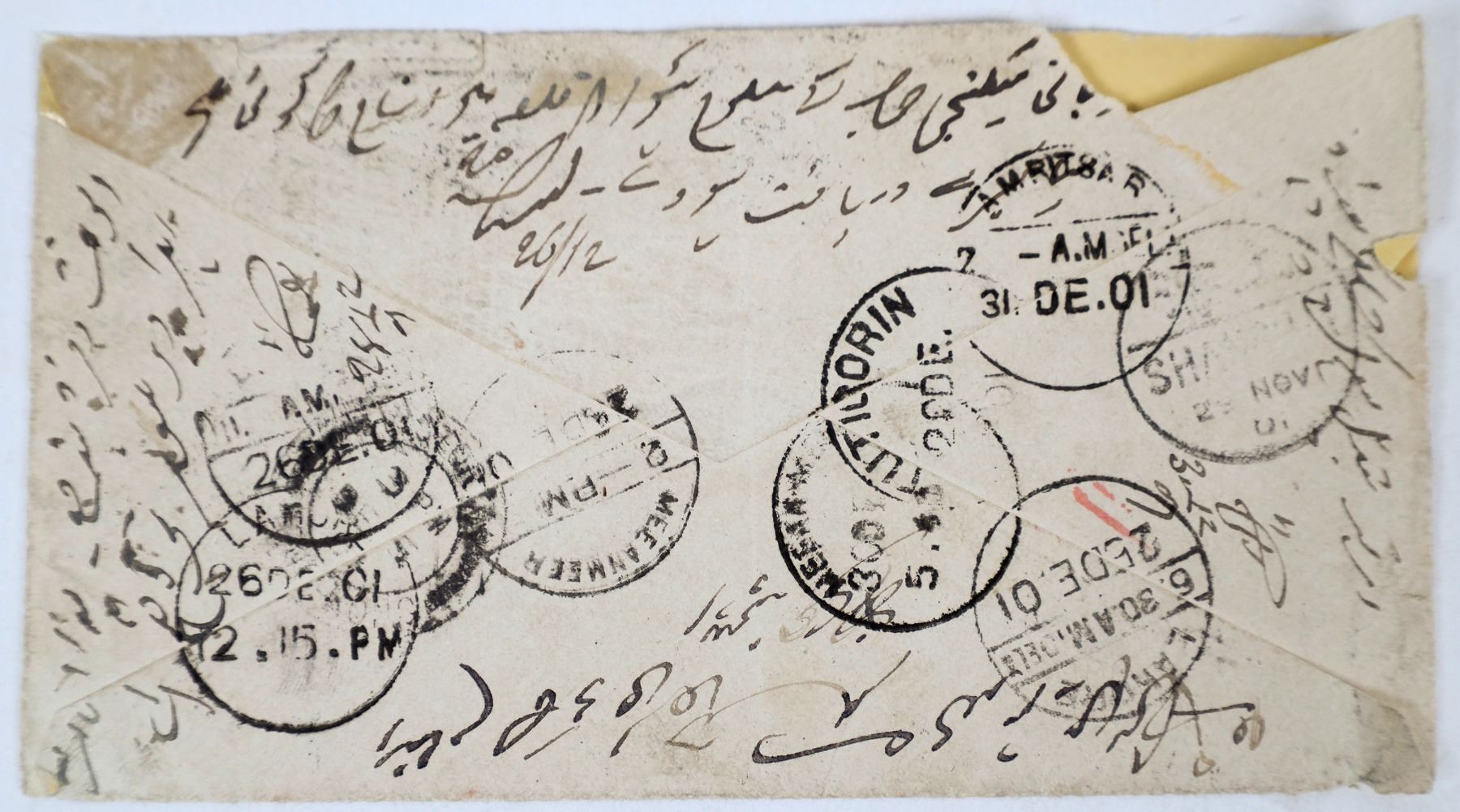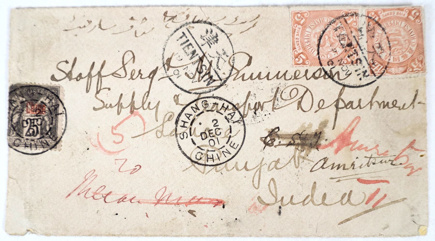 China 1901 cover to Staff Sgt. in Supply & Transport dept., Punjab, India, franked with CIP 5c (x2) tied by Tientsin Nov 19 dater, then by French Offices 25c (bit over edge) tied by Shanghai Dec 2 dater, forwarded to Amritsur with many transits and notations on reverse, bit of edge wear, scarce combination and destination.