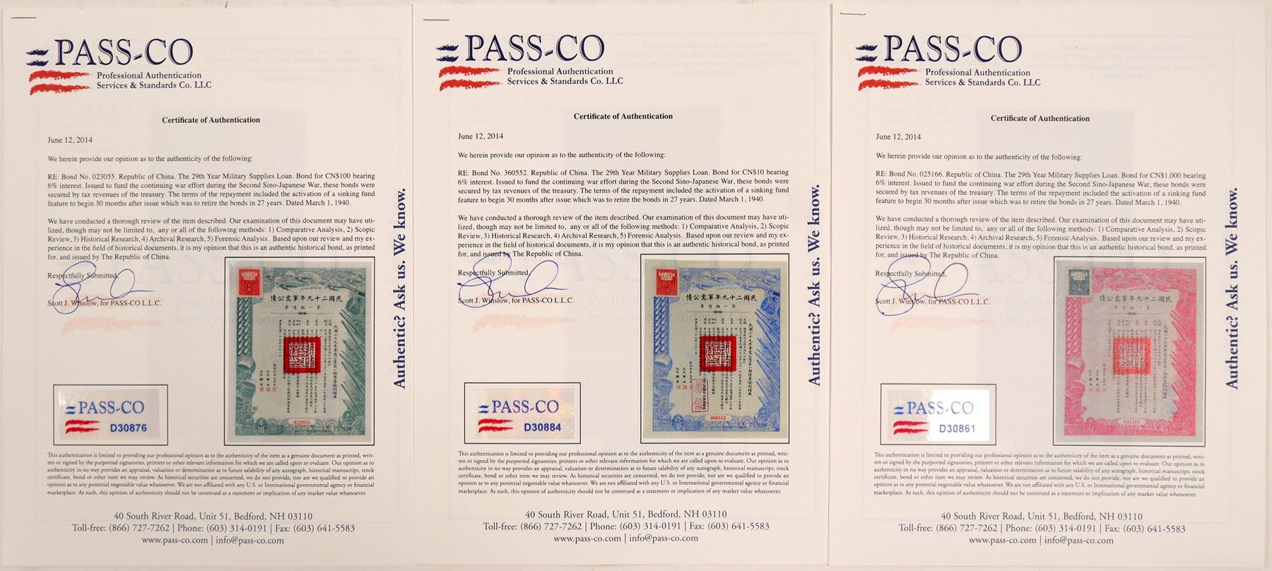 Three different bonds: Three of the Military Bond suite, $10, $100, $1000, all 1940. Each with a PASCO certificate of authenticity.