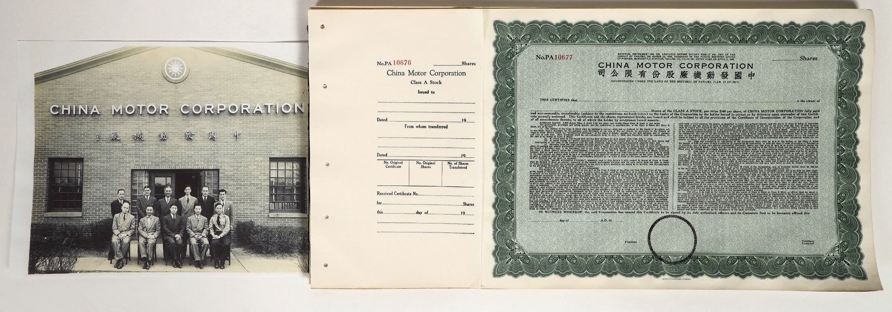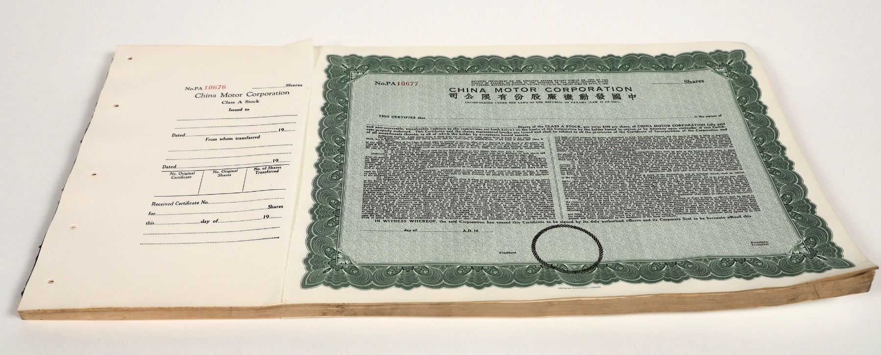 This describer has never seen these before. The company operated in 1942. They were the first Chinese factory manufacturing jet engines. It was established with the U.S. Army and the Chinese Government. Book of 100 unissued certificates with the name in English with Chinese characters below. View picture showing the top managers, chief engineers, and American consultants in front of the China Motor Corporation. Plant located in Kuichow (now Guizhou) China. Rare.