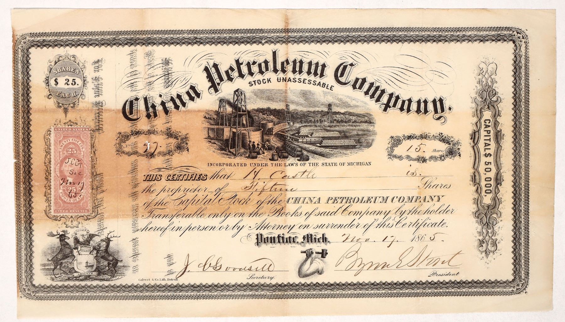 VERY EARLY AND VERY RARE MICHIGAN OIL. Perhaps unique. # 27 for 15 shares to H Castle on November 17, 1865! Dateline Pontiac, Michigan. Oil field vignette! Six panels - one has been sun bleached. Small perforation along left vertical crease.