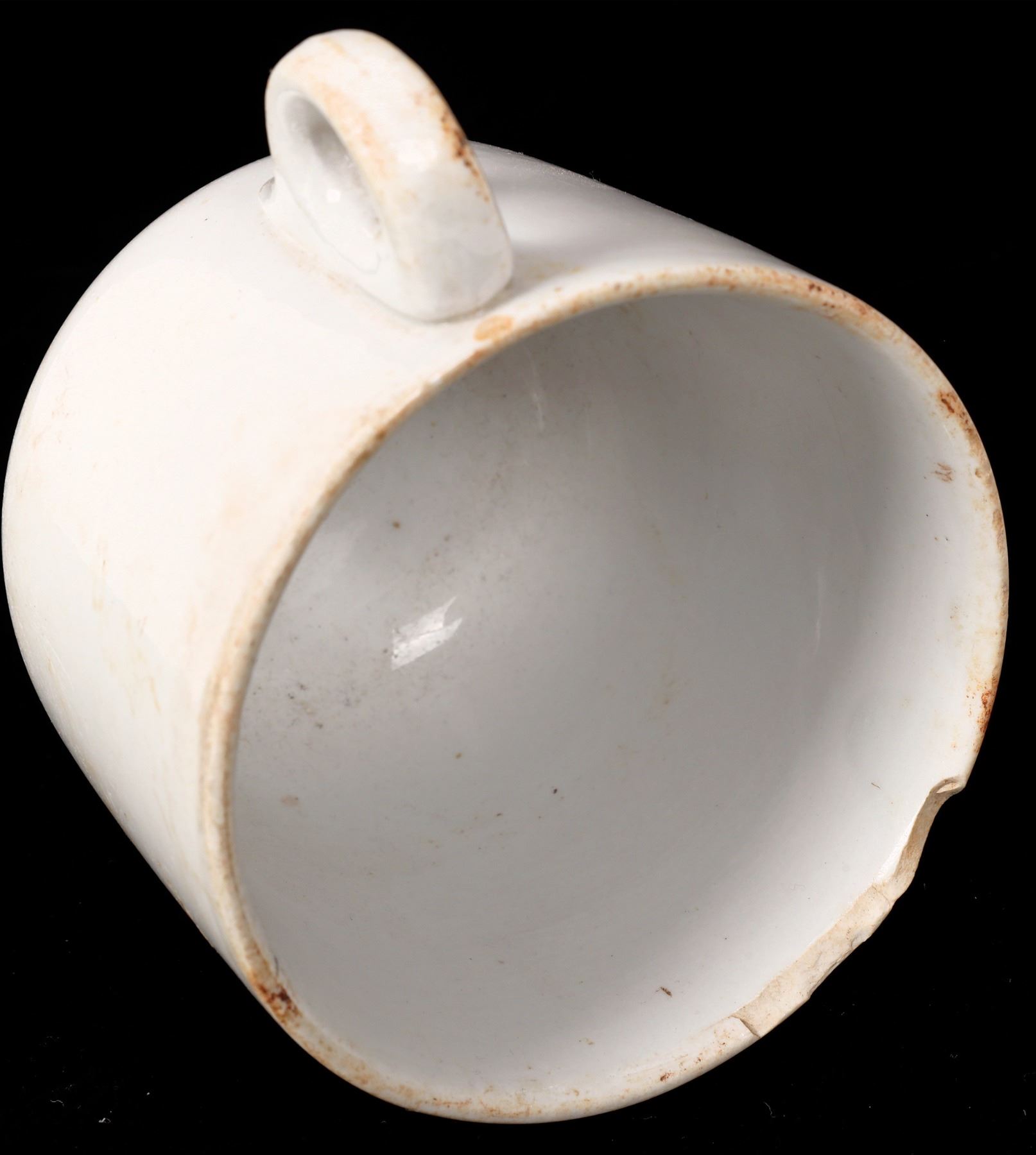 Old China & related items. Small embossed mentholated? container bottom 1.75" with thread chip. Container base 1.25x2.5". Knowles, Taylor & Knowles soap dish 4.25x5.25". Unmarked cup 3.25x4.5" with lip chips. Please inspect.[ China