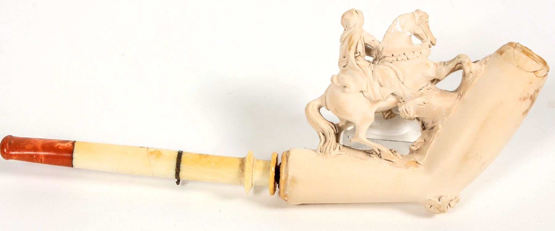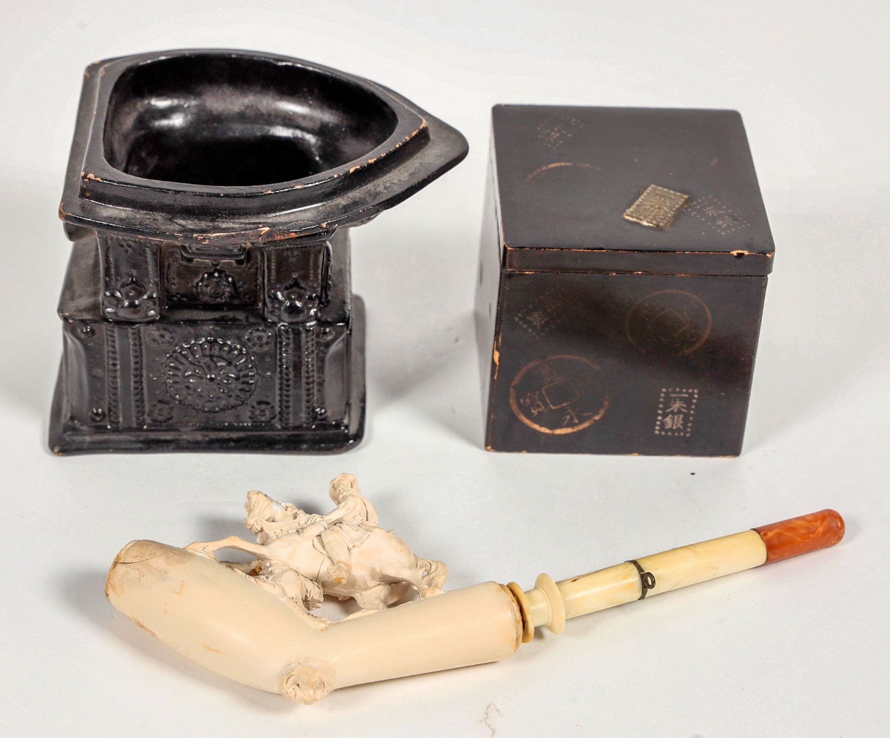 Lot of 3. A carved cigarette holder possibly a Bedouin on a horse in full stride. Two pieces: possibly a pen and ink well holder. And a small ink well.