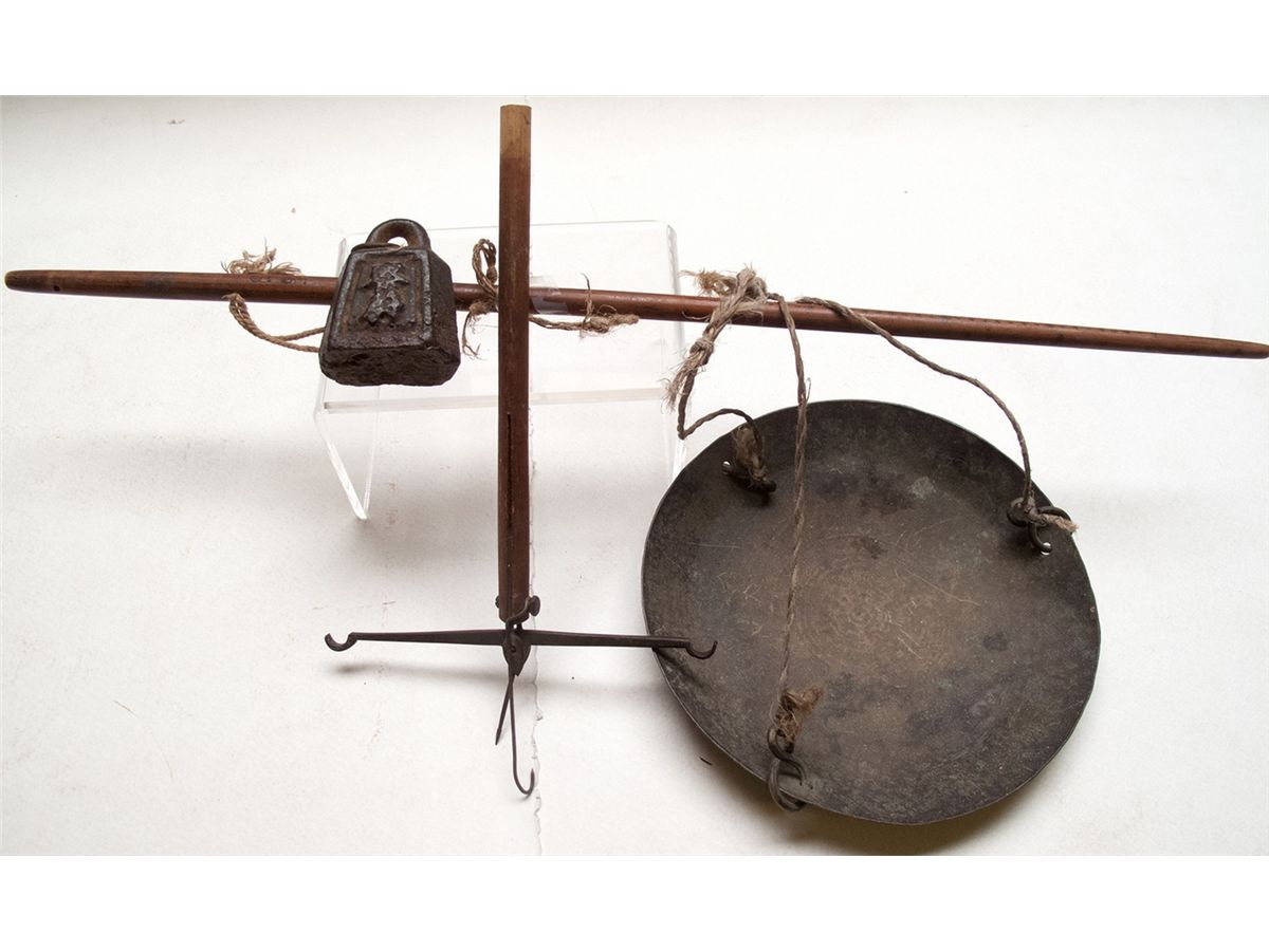 Large single tray scale, with heavy counterweight balance. Balance beam is mounted to a wooden post, 8" long. There is an accessory wooden bar, with cord suspenders, over 22" long. The cord-suspended tray is 8" in diameter, about 1" deep. The weight has a Chinese character cast into each side, and weighs 24 oz. Nice age patina, and a very unusual piece.City: County: State: Date:
