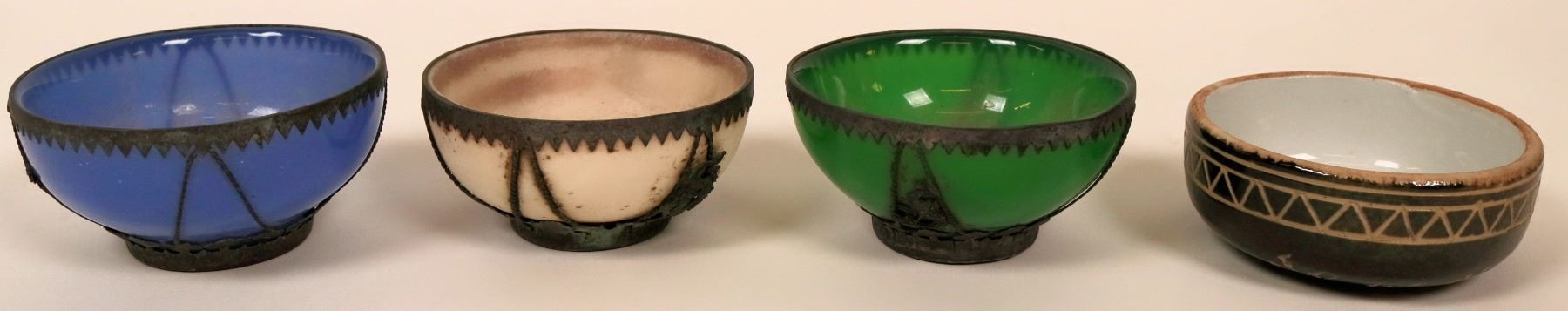 Four Chinese bowls, 4.25" diameter; 3 are matching with metal lips and base attachments, with a hallmark on the bottom. One of tech four appears to be stone, the others green and blue glass. The fourth is a ceramic bowl. age unknown, probably 20th c, pre-WW2.