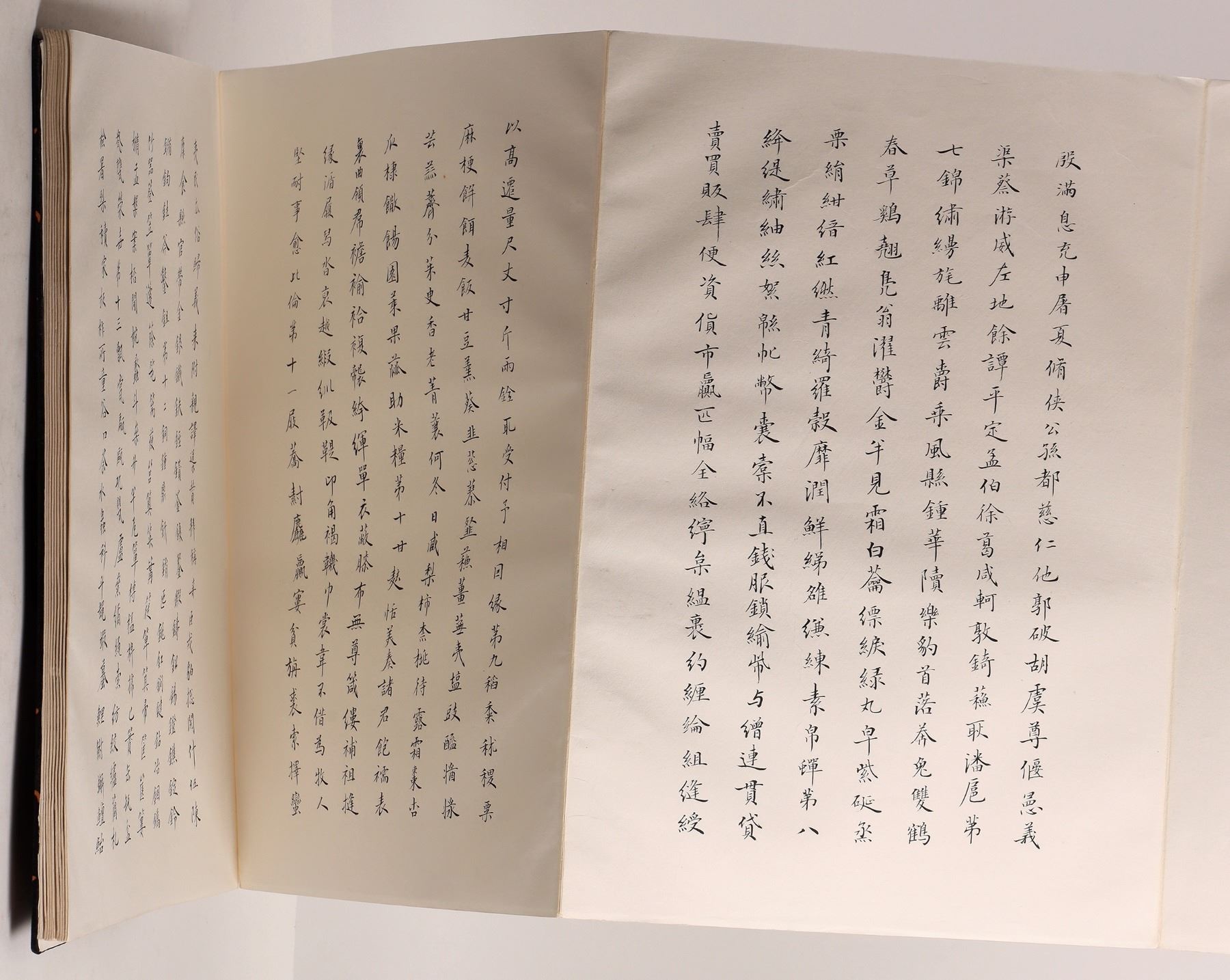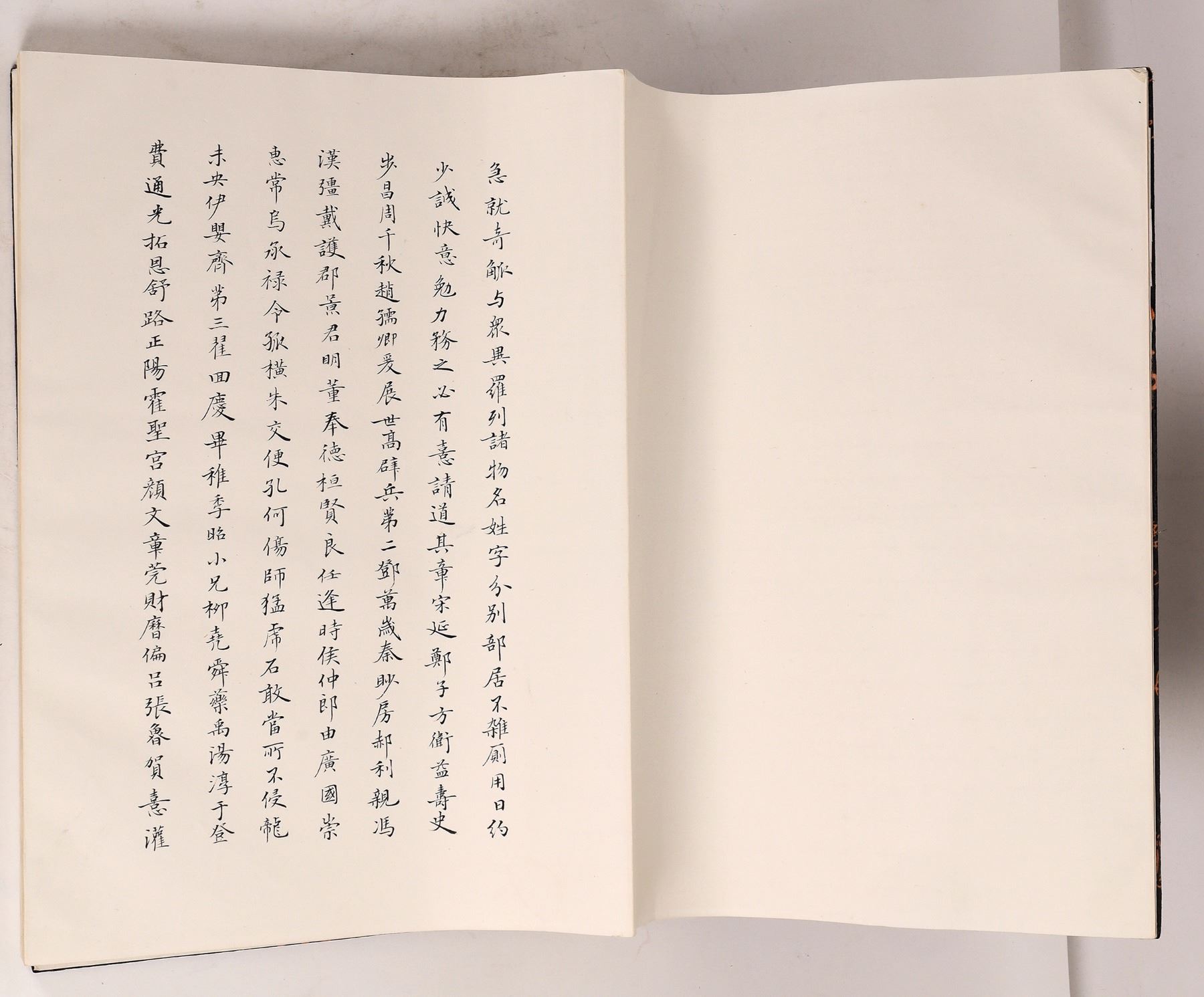 A VERY RARE book of a Chinese calligrapher's personal marks. Approximately 14" x 19.5", hardback clothbound book, black with orange marks, no spine with accordion folded pages & black ink inscriptions. Some wear on two corners. Please see photo(s) for more details.[ China Chunlin Zhu Collection